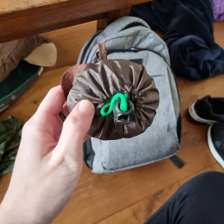 Очень мило! Складывая сумку внутри, убеждайтесь начать с дном сумки для предотвращения воздуха от принимать космос. Кроме того, сумка супер легко сложить и удобно носить с собой! Я обрезала его на моем рюкзаке 'с молнией.