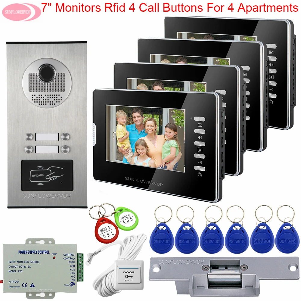 Для 4 квартир контроль доступаRFID карты разблокировки видеодомофонаДля квартиры из 4 единиц качественный цветной 7-дюймовый проводной многоблочный видеодомофон дверной звонок Домофон системы