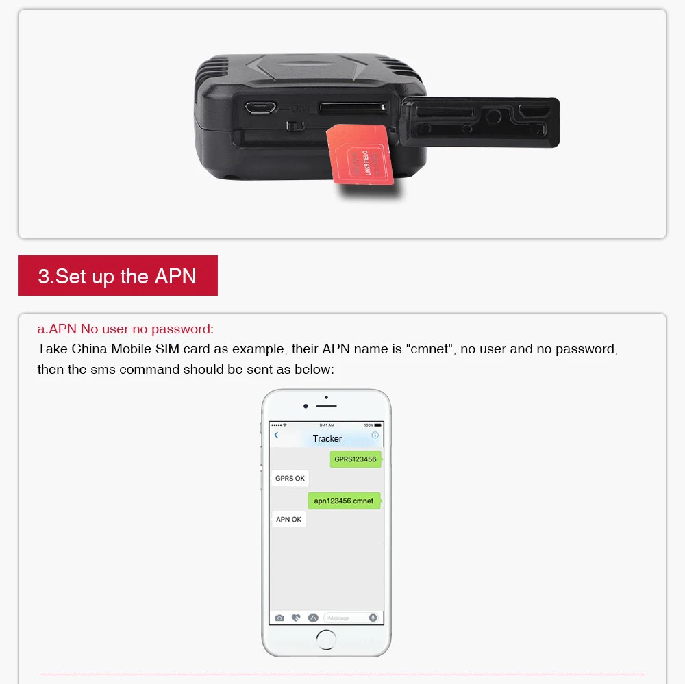 В: что вы должны подготовить после получения устройства? A: * Пожалуйста, получите подходящую sim-карту для этого gps-трекера, sim-карта должна быть совместима с сетью 2G GSM и должна быть обычной sim-картой; * Пожалуйста, включите «GPRS Интернет-трафик данных» и «дисплей идентификатора звонящего» функции sim-карты * Пожалуйста, убедитесь, что sim-карта имеет достаточный баланс и удаляет пин-код; * Пожалуйста, получите эту информацию от поставщика sim-карт: Имя apn, имя пользователя apn, пароль apn, номер MCC, номер MNC. В: как войти в мобильное приложение и веб-сервер? О: * Вы можете отсканировать qr-код в руководстве пользователя, чтобы загрузить последнюю версию приложения; * Ссылка на веб-сервер: www.lkgps.net * Вы можете войти в приложение и веб-сервер с идентификационным номером вашего устройства, пароль по умолчанию 123456. В: Как подключить устройство к приложению и веб-серверу? О: пожалуйста, настройте устройство с помощью команд ниже SMS, чтобы устройство стало онлайн в приложении: * Gprs123456 * Apn123456 apn имя * Apnuser123456 пользователя apn * Apnpasswd123456 пароль apn Например, мобильная sim-карта tesco в Великобритании, мы получили информацию APN ниже: APN имя: prepay.tesco-mobile.com APN Логин: tescowap APN пароль: пароль Затем sms-команды должны быть отправлены следующим образом: * Gprs123456 * Apn123456 prepay.tesco-mobile.com * Apnuser123456 tescowap * Apnpasswd123456 пароль Если без имени пользователя и пароля, пожалуйста, зажгите последние две команды! Спасибо! Надеюсь, вы можете наслаждаться устройством, любые сомнения, пожалуйста, не стесняйтесь связаться с нами в любое время!