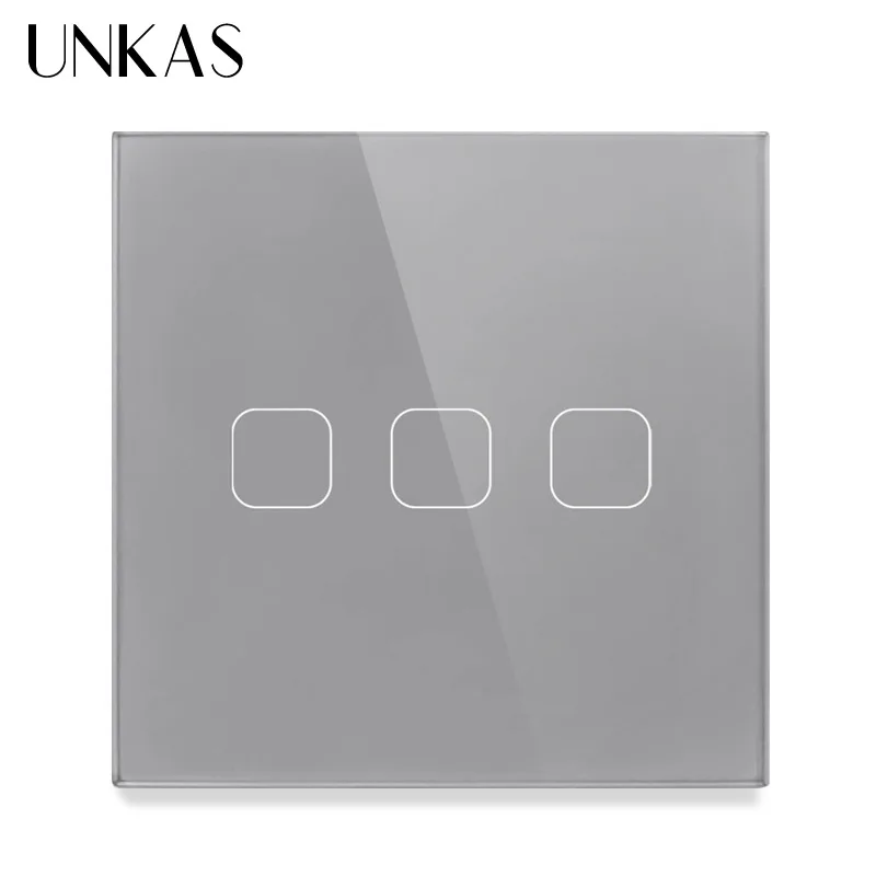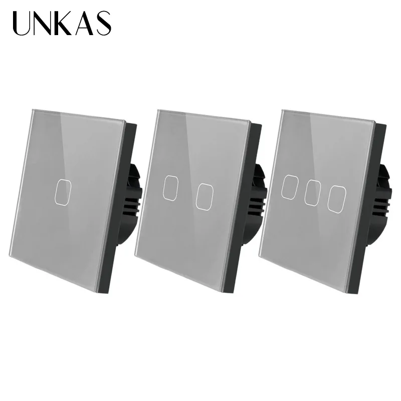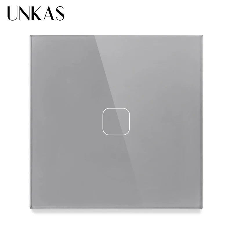 Сенсорный выключатель UNKAS, серая прозрачная стеклянная панель, стандарт EUUK, 123 клавиши, 1 канал, только сенсорный переключатель