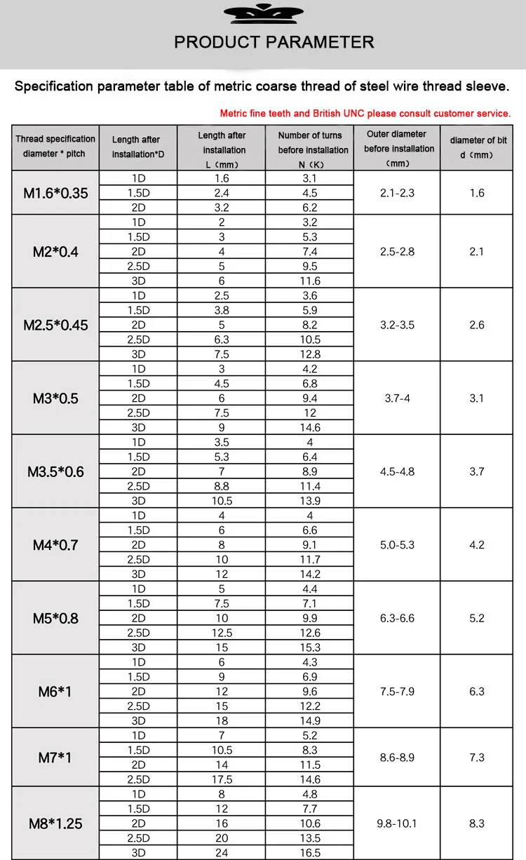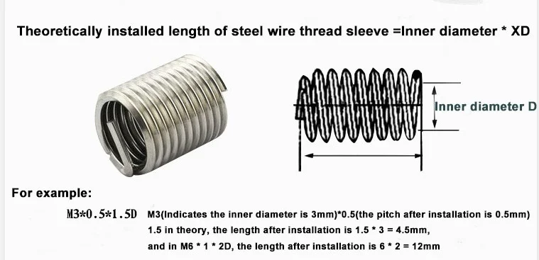 Примечание:1. Допускается небольшая погрешность в размере из-за ручного измерения.2. Цвет товара, отображаемый на фотографиях, может немного отличаться на мониторе вашего компьютера, так как мониторы не откалиброваны так же.3. Продукт также называется стальной резьбовой втулкой, резьбовой оболочкой, стальной проволочной втулкой, резьбовой втулкой, резьбовой втулкой для ремонта и т. д.4. Теоретически установленная длина рукава стальной проволоки = внутренний диаметр × XD, оригинальная Длина рукава стальной проволоки (длина перед установкой) меньше длины после установки, поскольку резьба Завинчивается в рукаве после установки, рукав растягивается дольше.