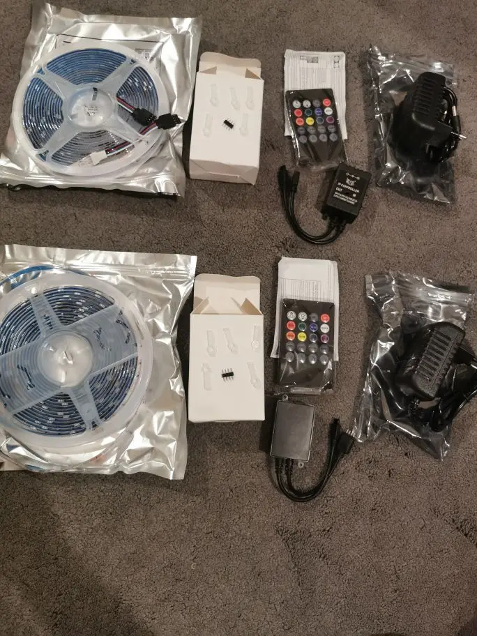 Доставка около месяца.Комплект 3 ленты,адаптер и муз.конироллер с пультом.Всё ок .Закащываю не первый раз у этого продавца.