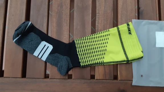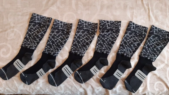 Носки по качеству хорошие, по размеру вроде подошли на мой 43 размер, стелька 27.5 см. Верх это просто ткань, пришитая к носку, довольно узкий подъем, на широкую ногу может не залезть, и нет силиконовый полосок, возможно носки будут сползать с голени.
