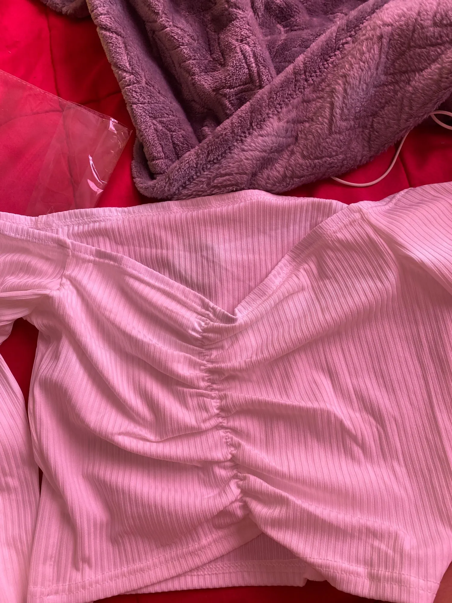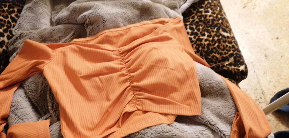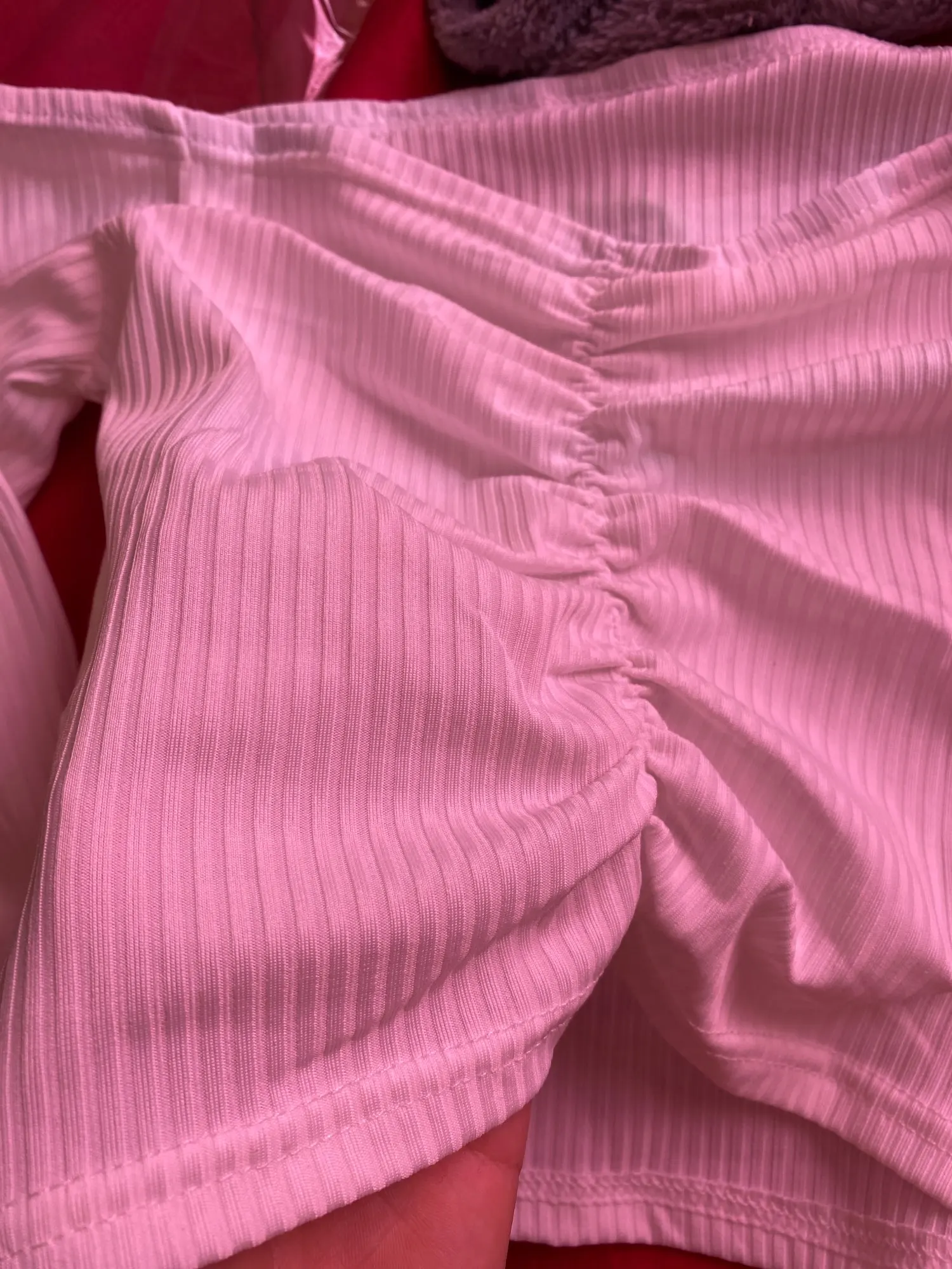 Ткань тоненькая синтетика. Фоткам не соответствует. Визуально модель топа такая же как на фото. Но качество отвратительное .
