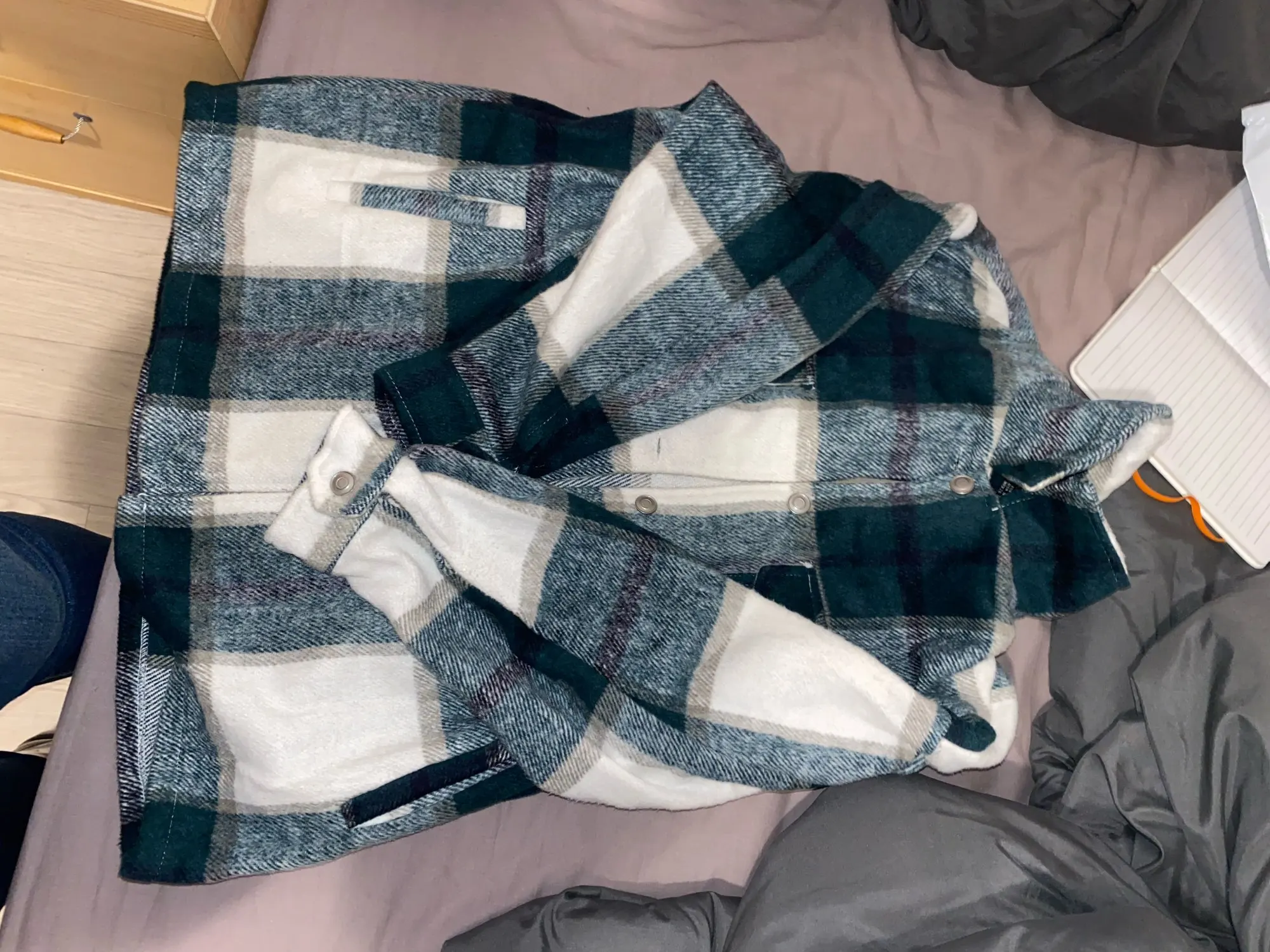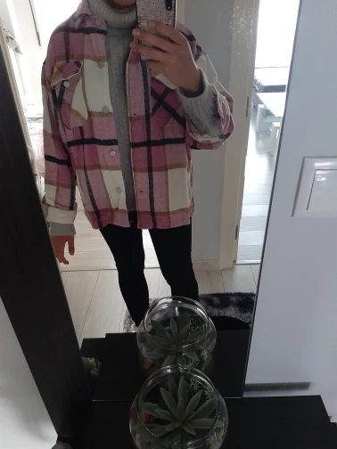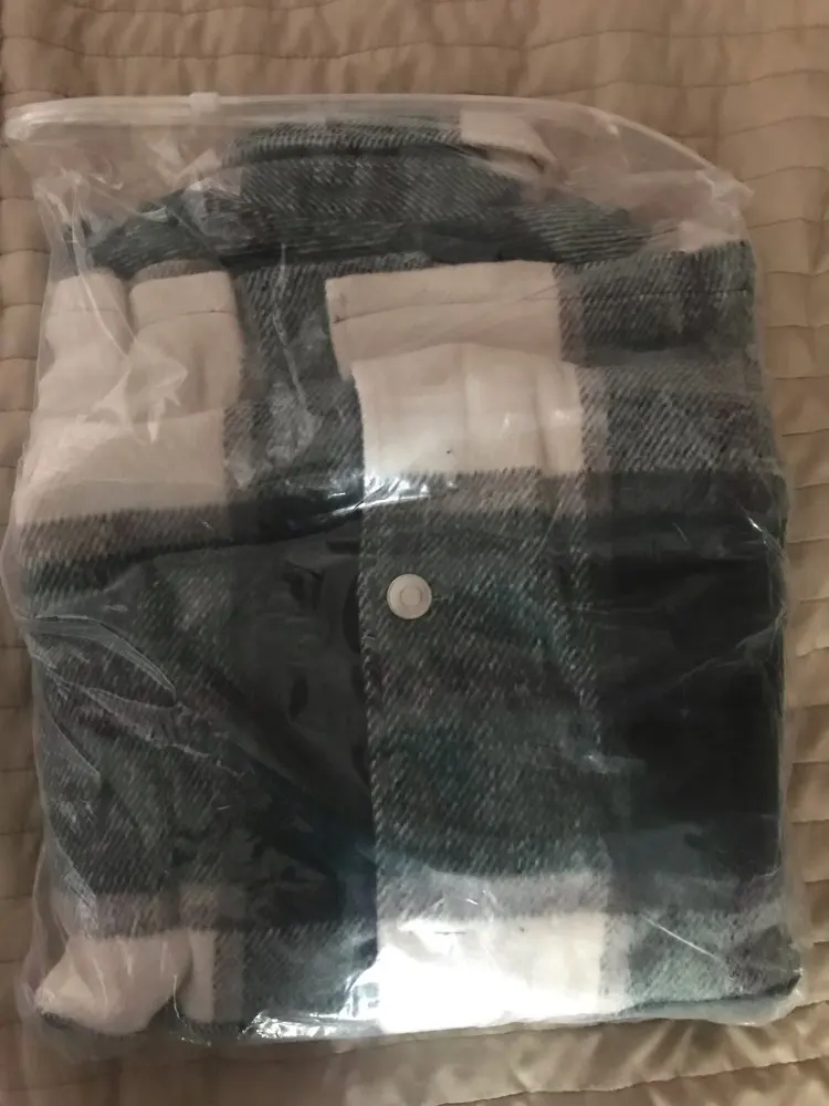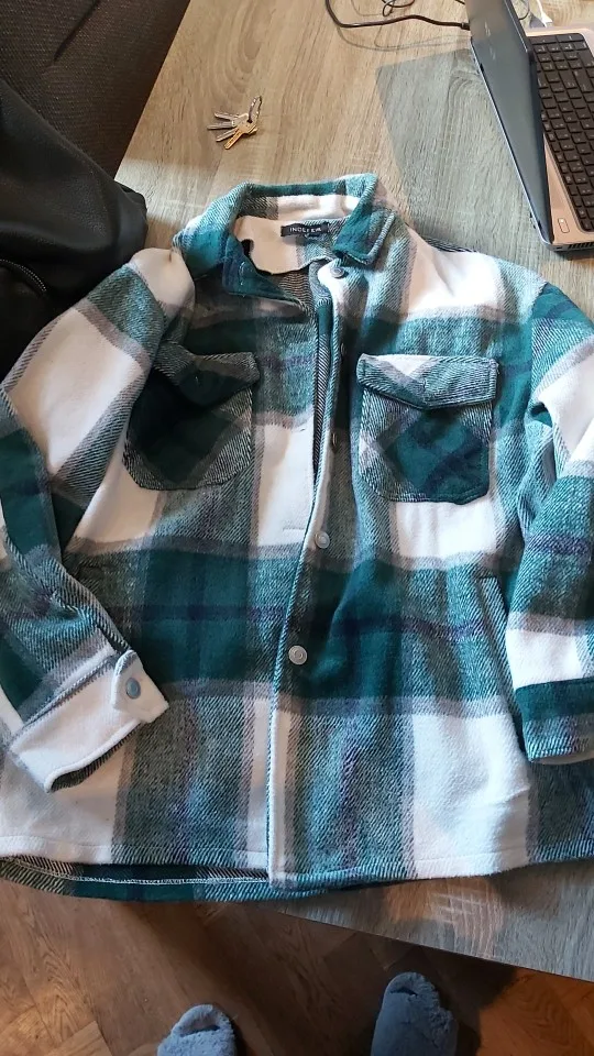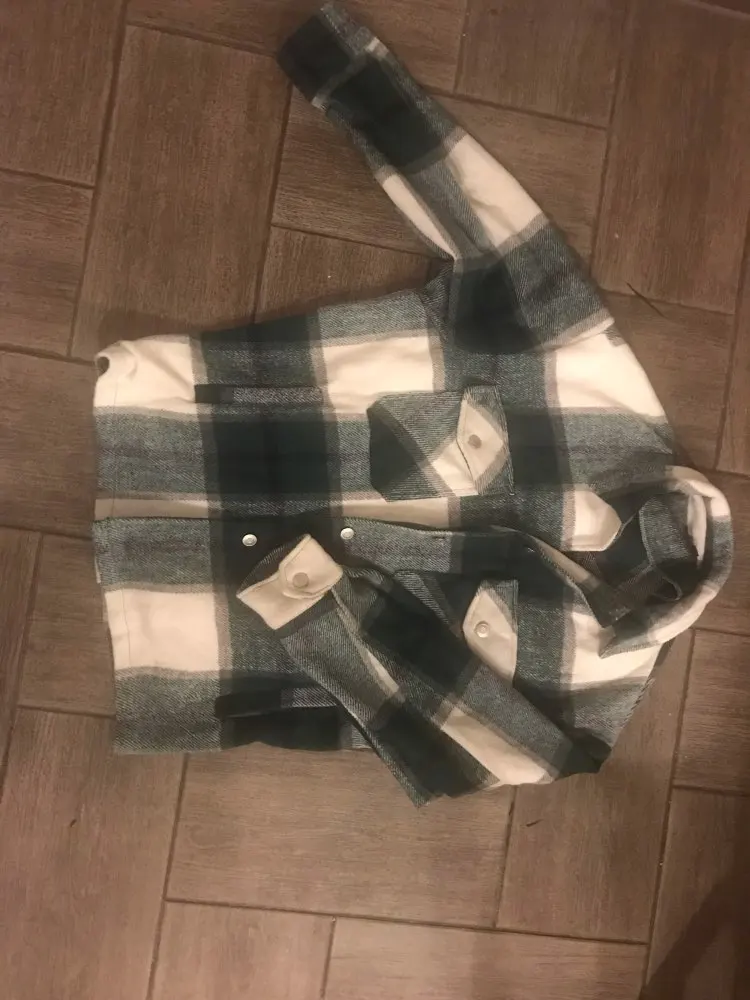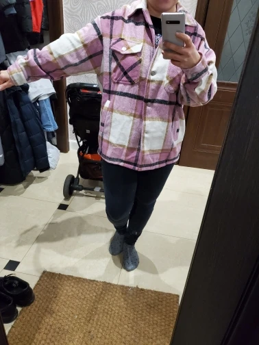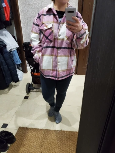 Плотненькая куртка-рубашка.До Питера шла 26 дней.модно носить и как куртку(особенно актуально весной) и как второй слой под куртку.Тепленькая,не колется.Только нитки кое-где торчали,но это все были концы швов.Пришла с небольшим запахом.Выветрился за три часа)