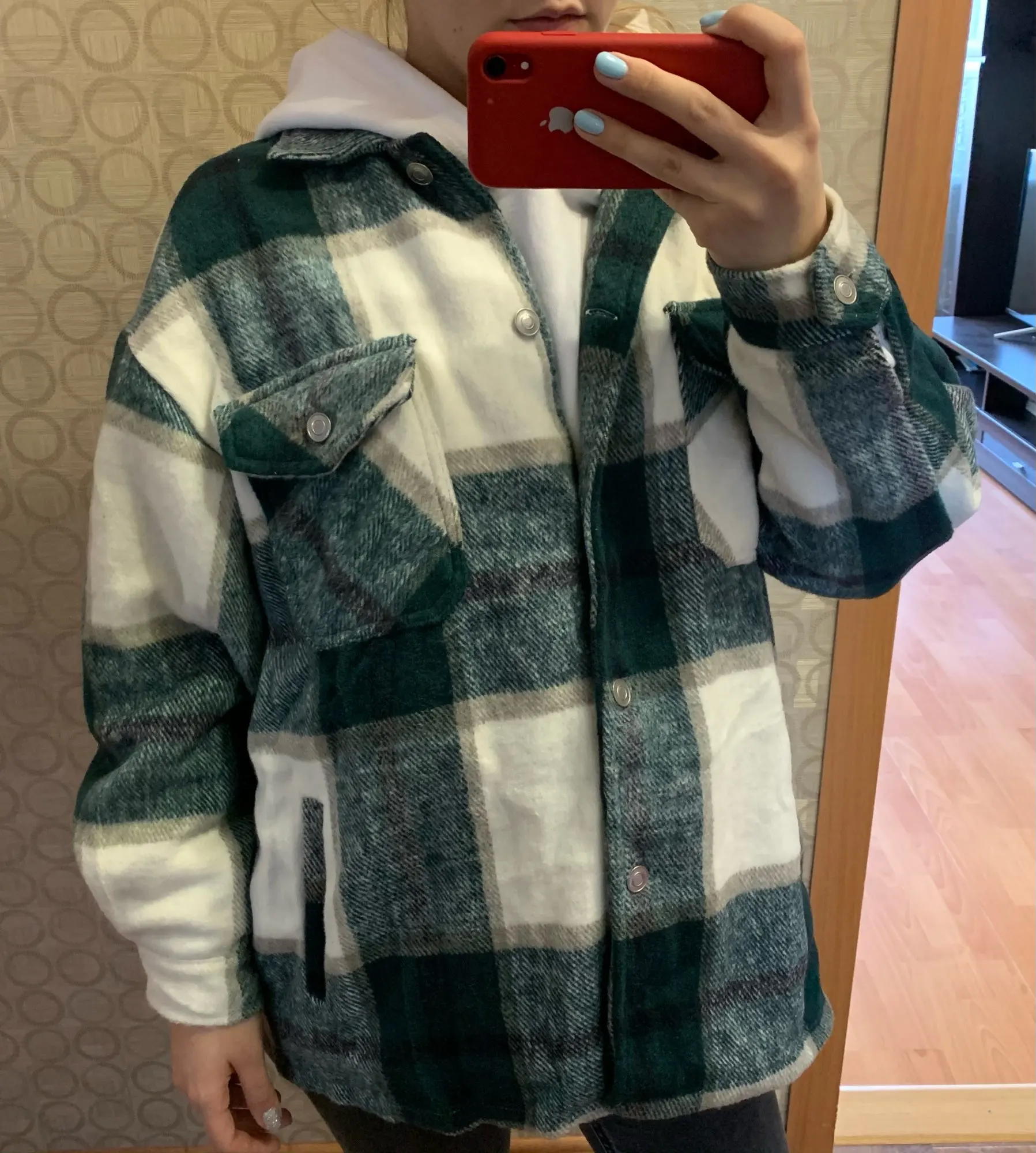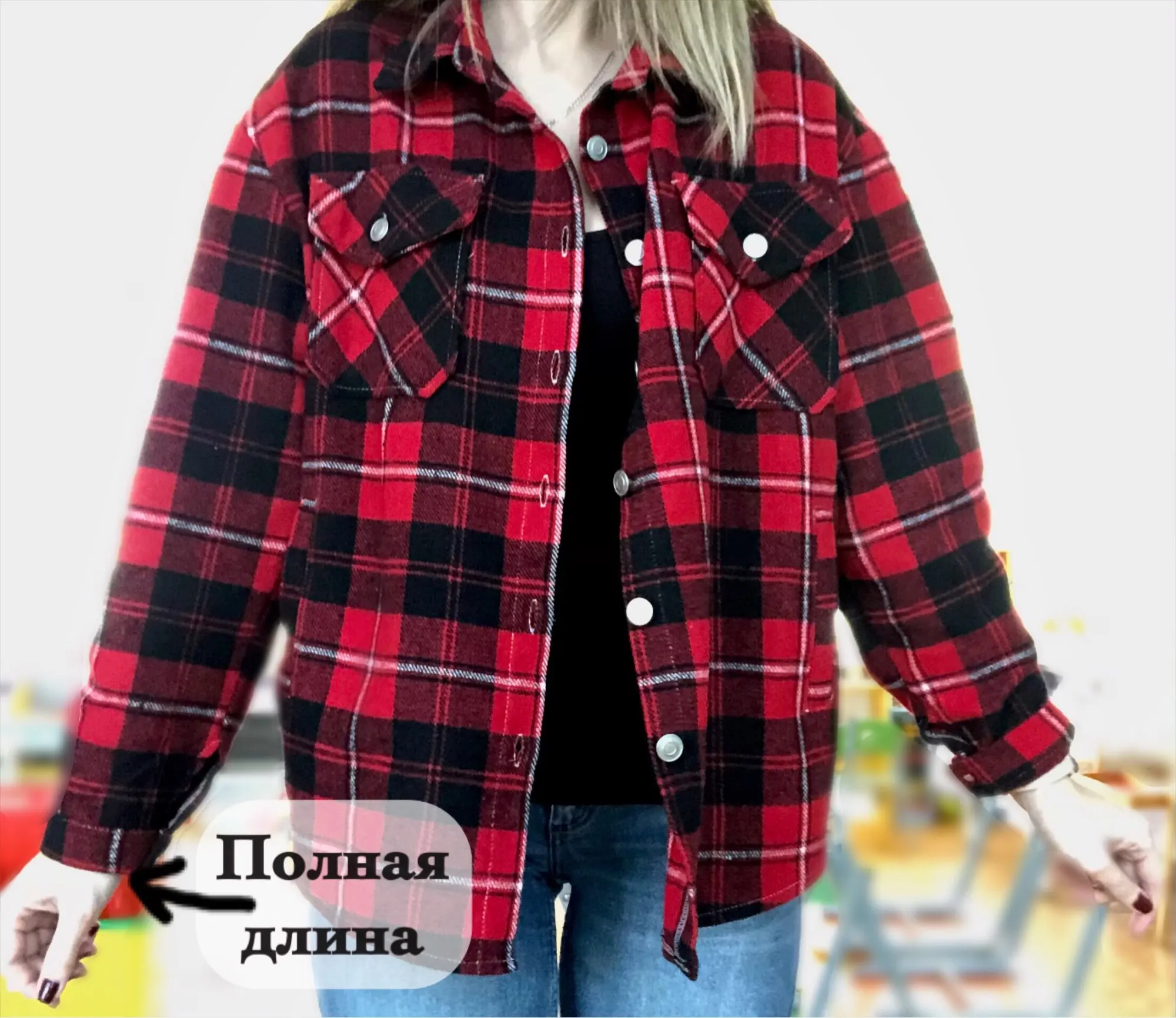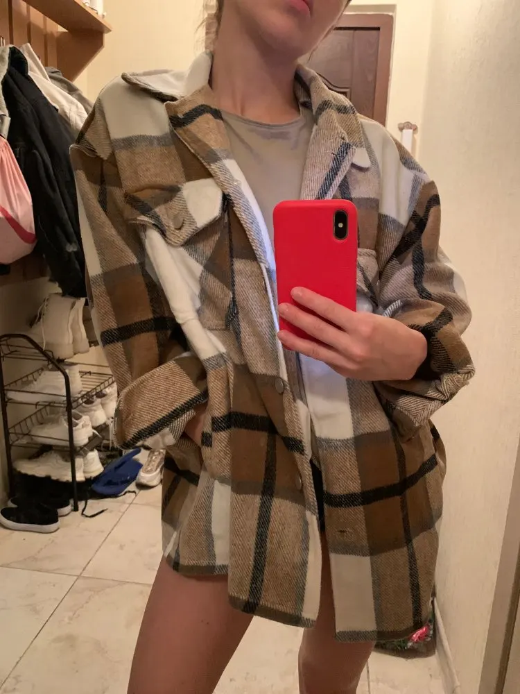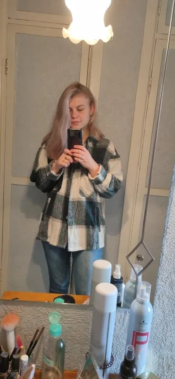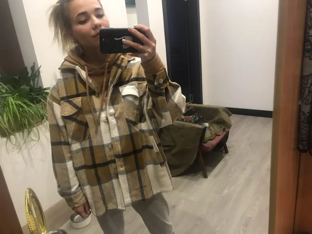 Рубашка очень понравилась, хорошо скроена, оверсайз уже заложен, поэтому берите саой размер. рукава тоже ок, хотя обычно с этим проблемы. Теплая, внутри не жесткая, как тут писали, я ношу с кроп-топом без проблем. 100% полиэстер. Было бы круто, если бы был подклад, меня подбешивают припуски и карманы, которые видно, ведь носишь нараспашку. И главное, пришла чуть больше, чем за неделю в Воронеж.