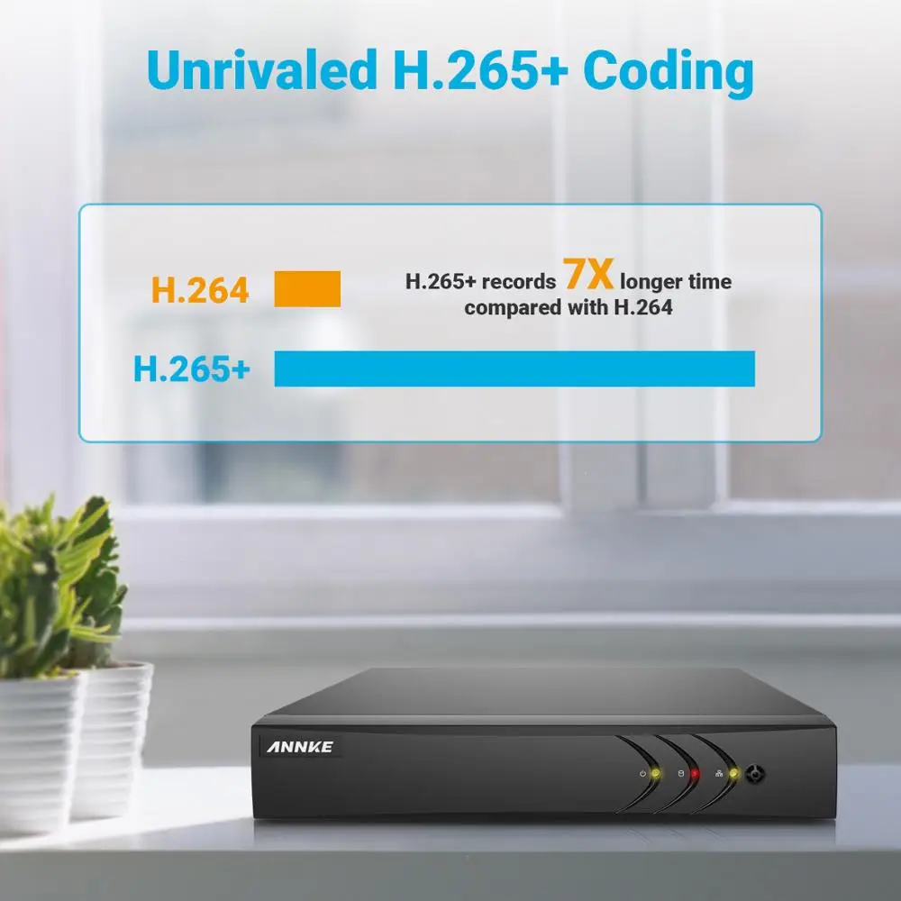 С данной технологией H.265 pro + кодирования, вы можете наслаждайтесь просмотром в режиме реального времени Потоковое вещание стабильно без каких-либо блоков и держите запись 98 дней непрерывно в течение 4-х камер одновременно с Предустановленная 1 ТБ HDD, что в 7х раз по сравнению с H.264, что экономит затраты на покупку дополнительного жесткого диска.