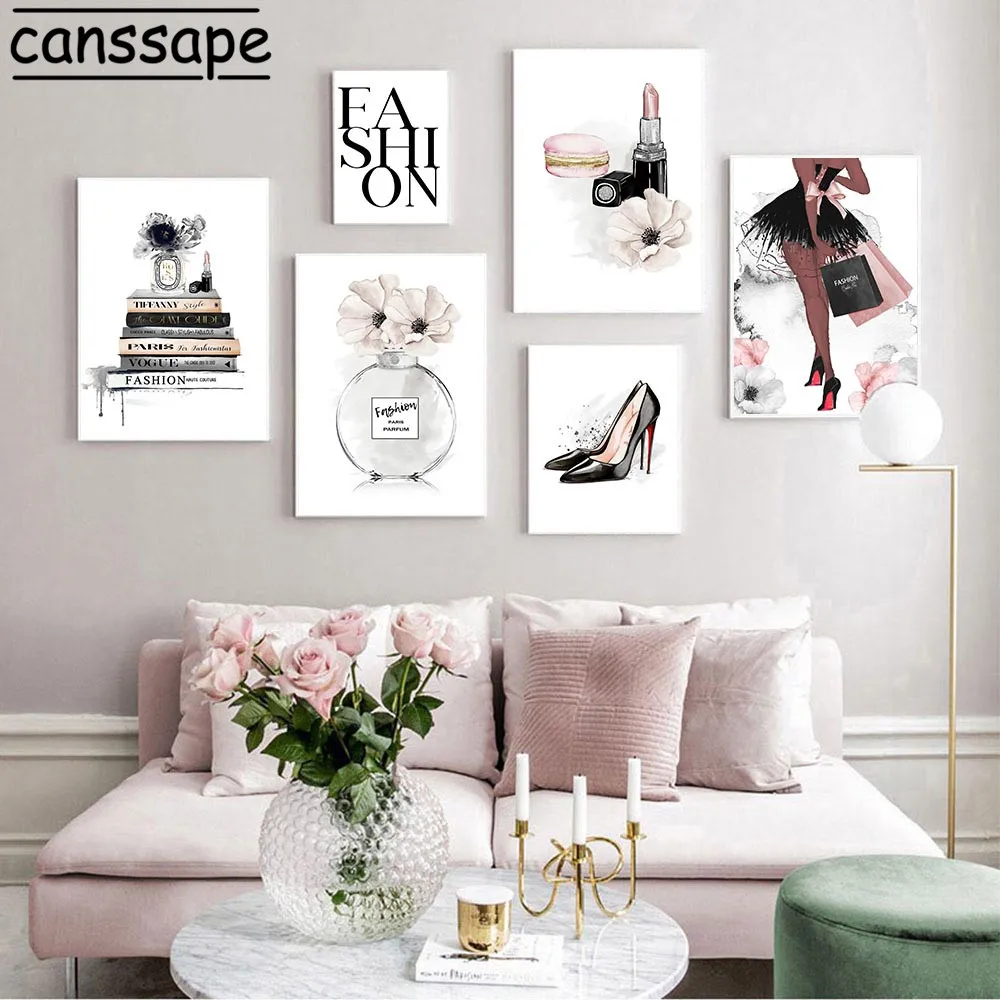 Модный плакат флакон духов на высоком каблуке Холст Картина Макияж ...