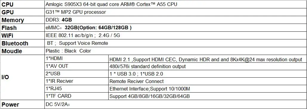-CPU: четырехъядерный процессор Amlogic S905X3 ARM Cortex A55;