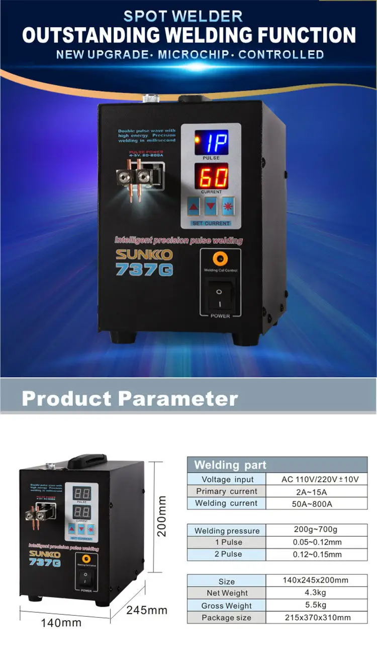 Точечный сварочный аппарат SUNKKO 737G, 1,5 кВт, светодиодный индик...
