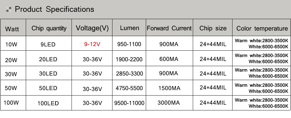 Светодиодный чип светодиоды DIY Светодиодная лампа источник света Матрица для точечного светодиодного прожектора 10 Вт DC 9-12 В 20 Вт 30 Вт 50 Вт 100 Вт 30-36 в
