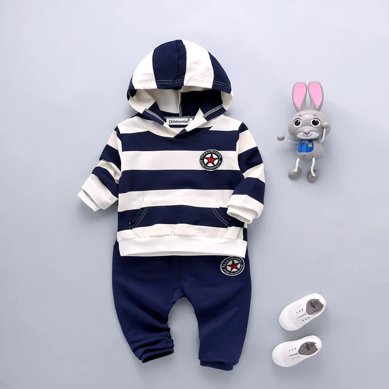 Комплект одежды для мальчиков, весна-осень 2021, детская одежда в полоску с капюшоном, костюм для малышей из 2 предметов, свитшот, детский спортивный костюм