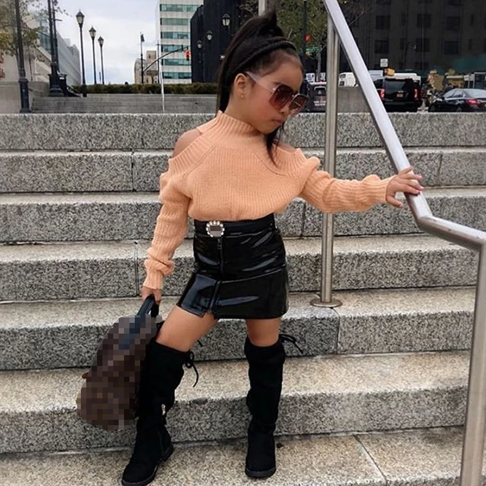 Одежда для новорожденных девочек 1-5 лет пуловер с открытыми плечами свитер Топы юбка из ПУ кожи