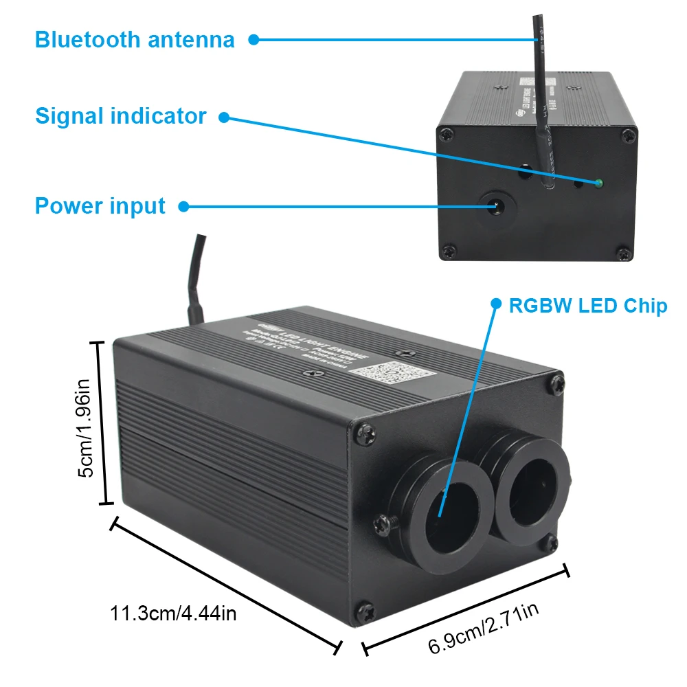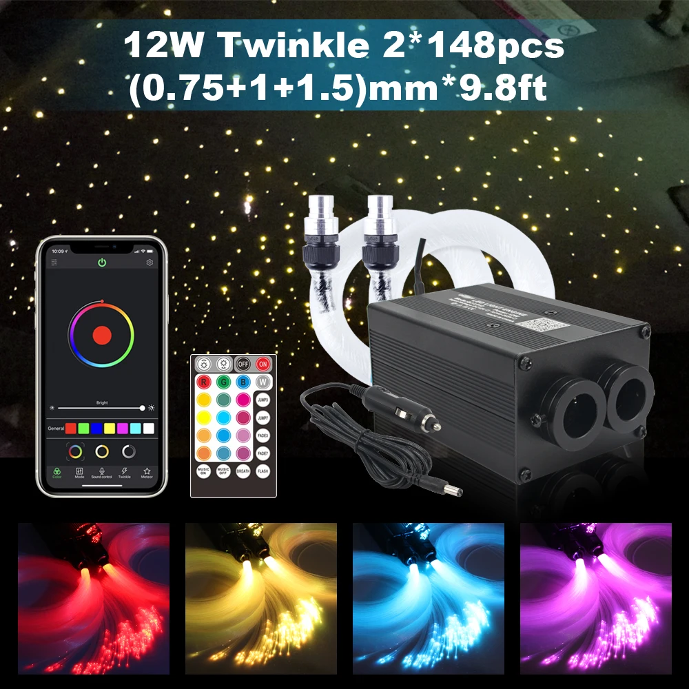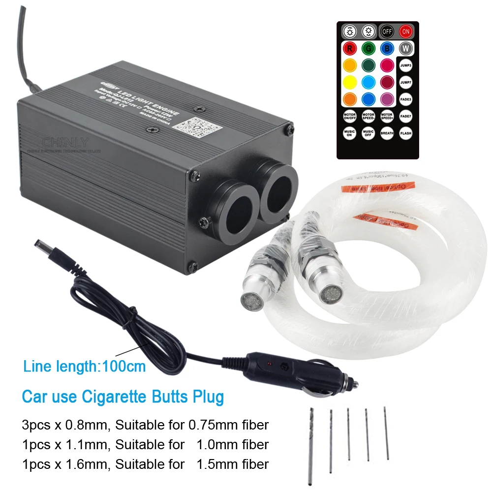 1x12 Вт RGBW мерцающий светильник управления двигателем(Управление через приложение Bluetooth + управление музыкой) 1x RF пульта дистанционного управления(Аккумулятор в комплект не входит) 2 рулона 3 м длина *(135 шт * 0,75 мм + 10 шт * 1,0 мм + 3 шт * 1,5 мм) концевой светящийся оптоволоконный кабель 1x разъем питания для автомобильного прикуривателя 1x Руководство пользователяФотографии выглядят следующим образом: