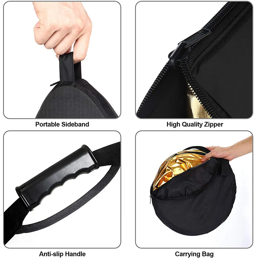 Используйте съемный двусторонний чехол на молнии для отражения света в теневых областях вашего предмета. Выбор цвета: серебро, золото, белый, золото/серебро, смесь будет определяться условиями освещения и вашими личными предпочтениями.