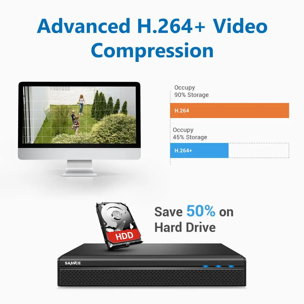 H.264 + значительно повышает эффективность сжатия и передачи без ущерба для качества видео. По сравнению с H.264, H.264 + снижает пропускную способность сети и экономит до 50% больше места на диске, тем самым экономит для вас больше затрат.