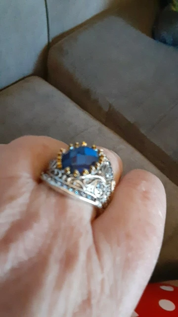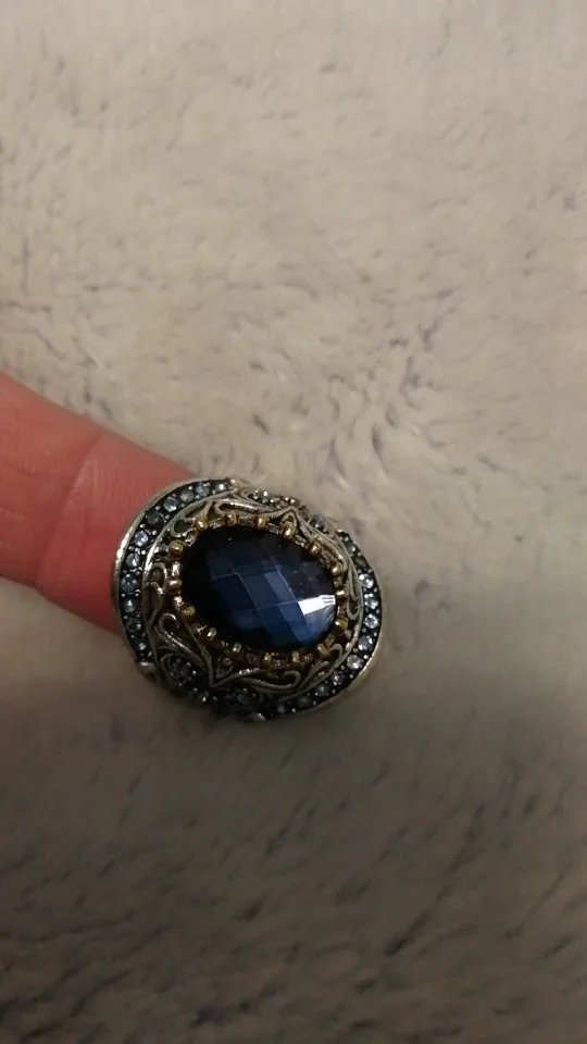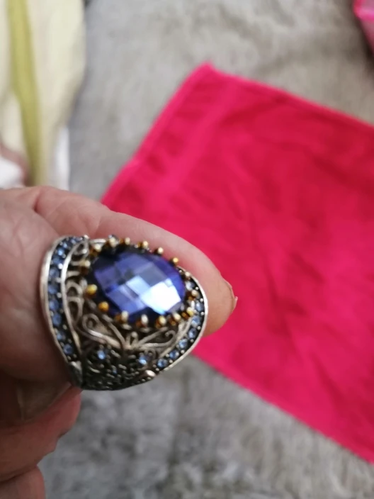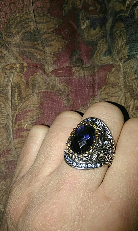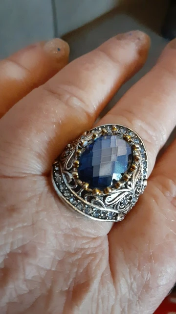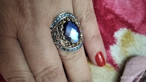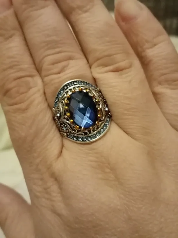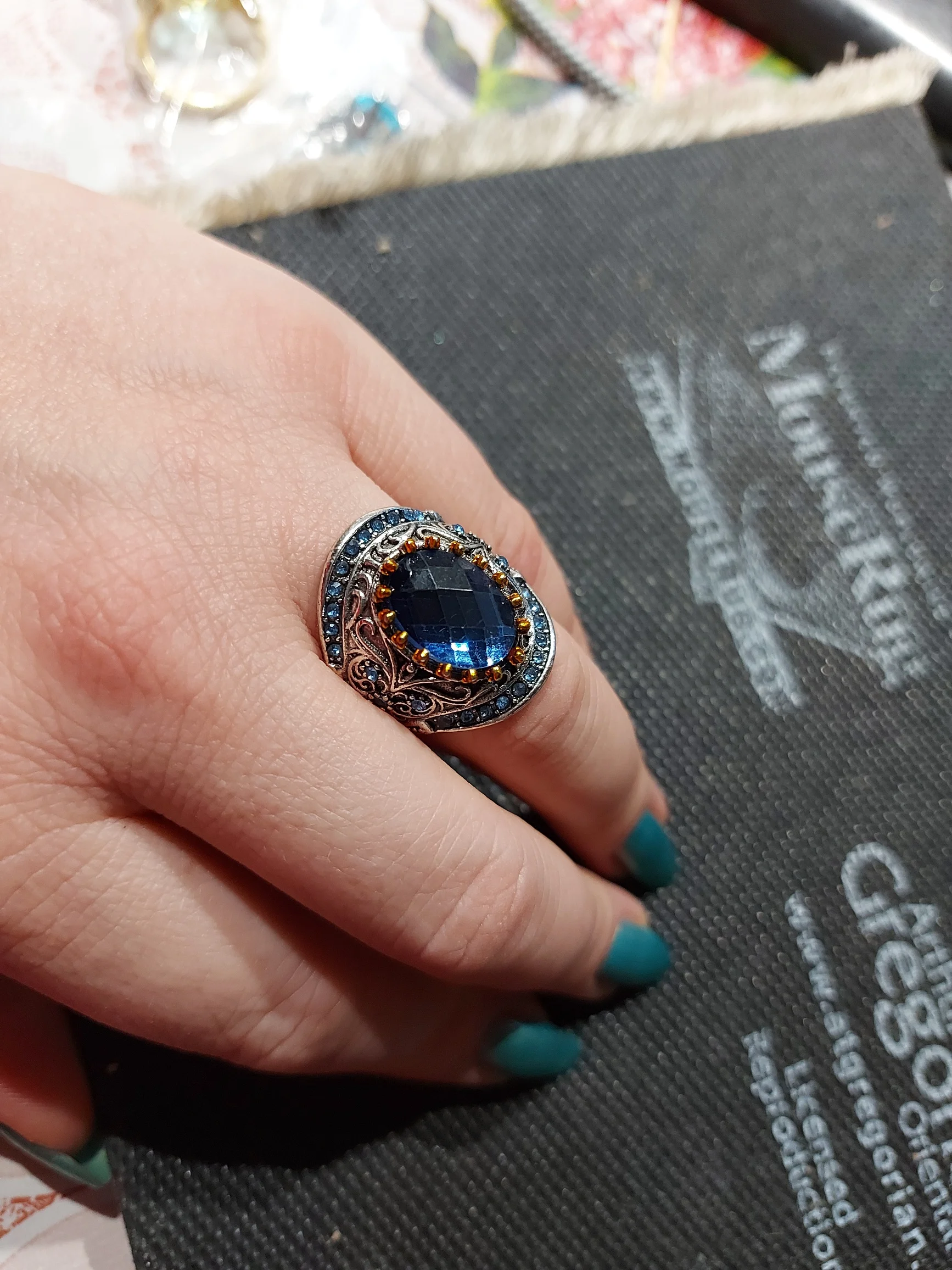 Издалека кольцо замечательно смотрится, но при более тщательном осмотре видно, что кольцо дешёвое. Центральный камень на гранях потертый и создается впечатление, что его сверху красили, но не прокрасили. Немного маломерит. Я брала 8, обычно на средний палец норм, но это только на безымянный. Так что смело берите на размер больше.