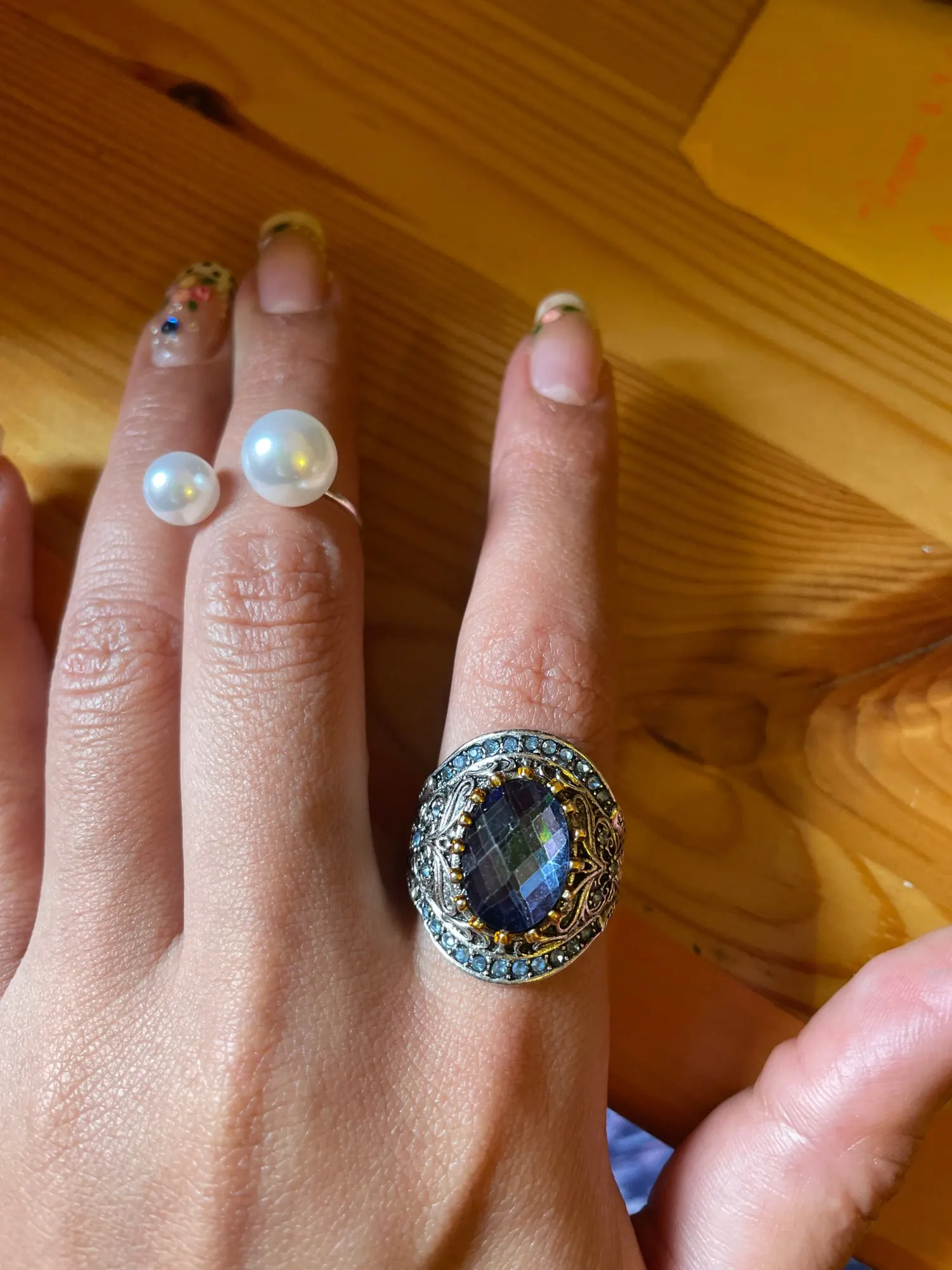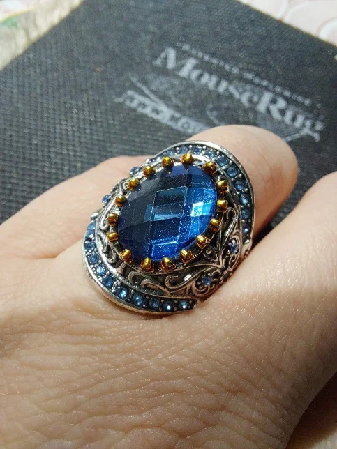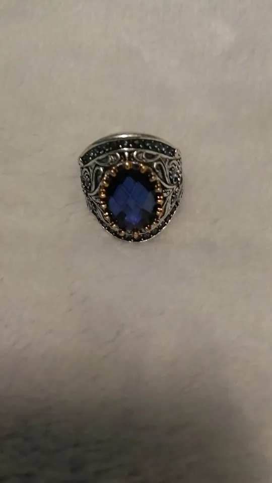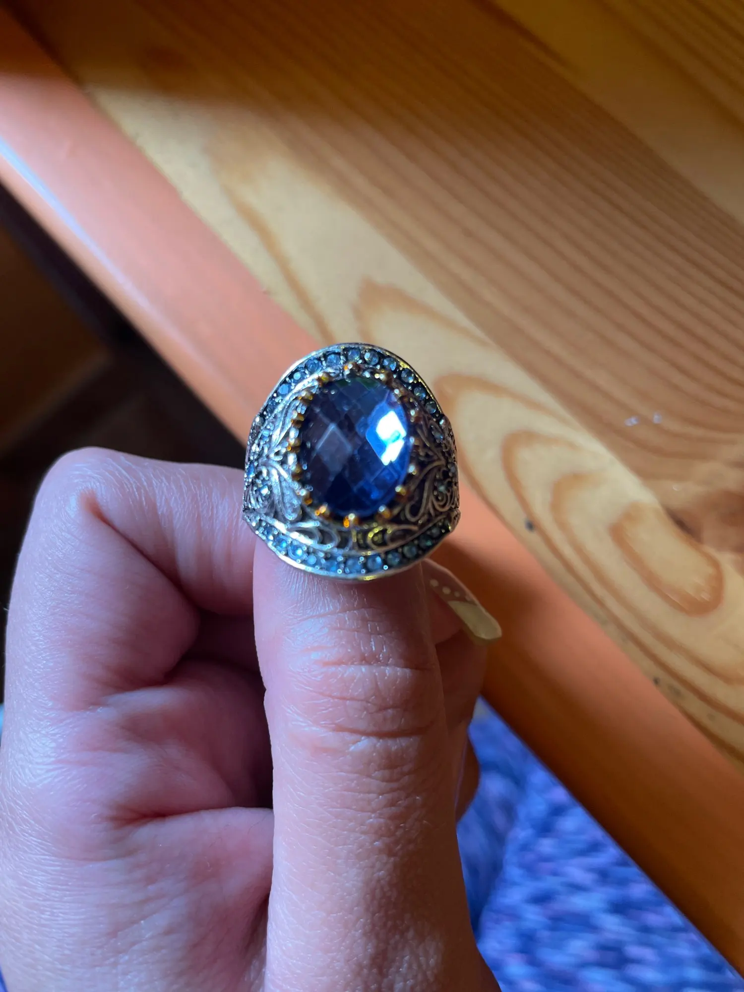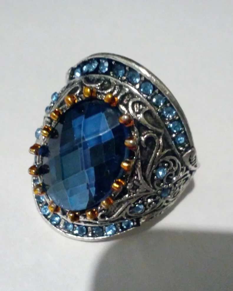 Издалека кольцо замечательно смотрится, но при более тщательном осмотре видно, что кольцо дешёвое. Центральный камень на гранях потертый и создается впечатление, что его сверху красили, но не прокрасили. Немного маломерит. Я брала 8, обычно на средний палец норм, но это только на безымянный. Так что смело берите на размер больше.