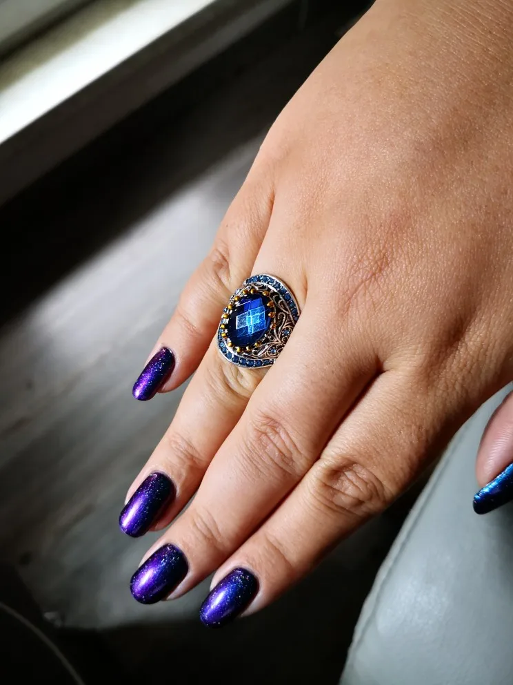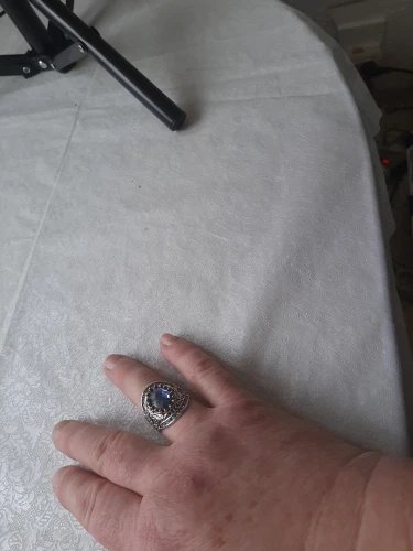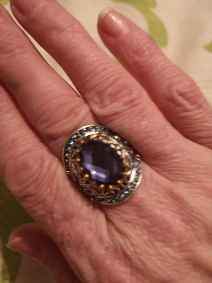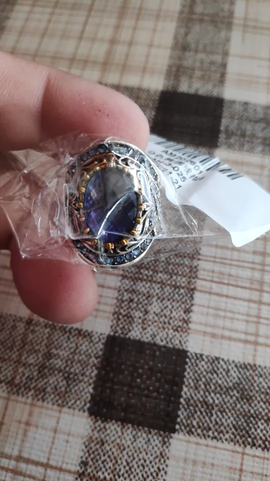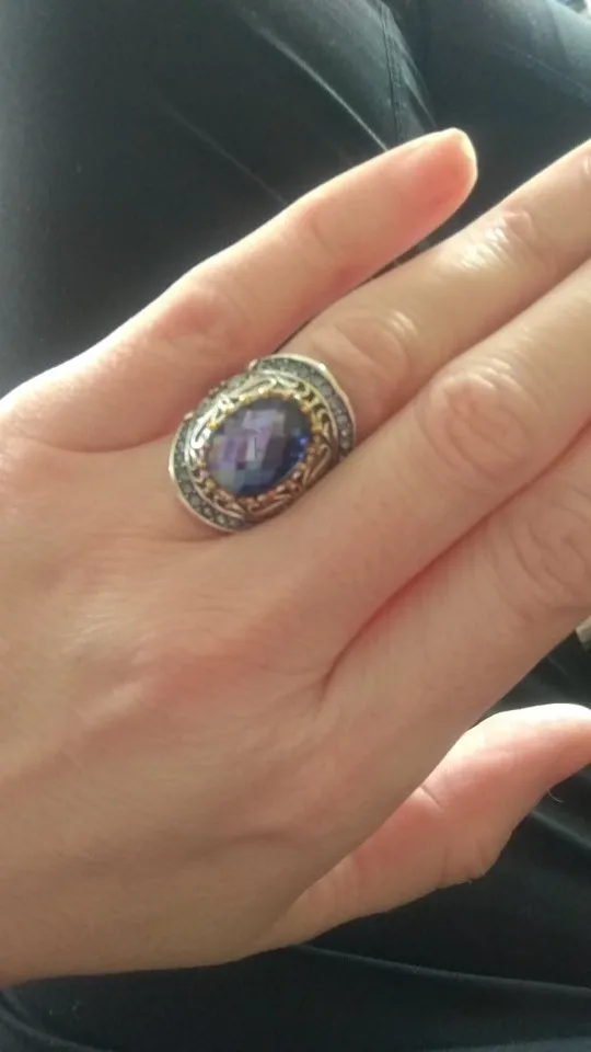 Прекрасное кольцо с растительной ковкой. На фото оттенок голубого теплее, все таки он более сиреневый, холодный, фиолетоватый. И форма на фото более овальная, а в жизни круглее чуть. Доставка не долгая, месяцок с другими товарами, нормально. Советую. Экзотично!