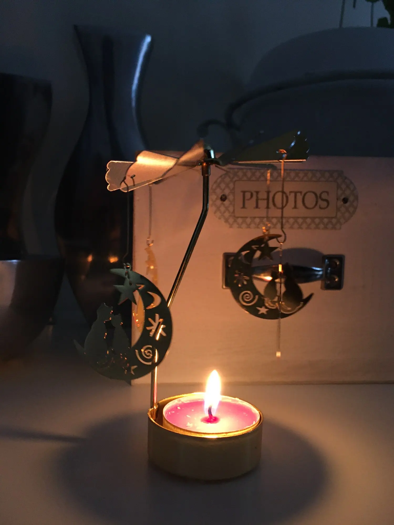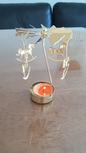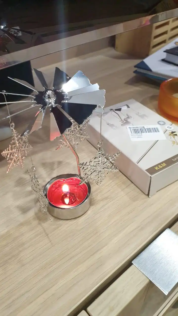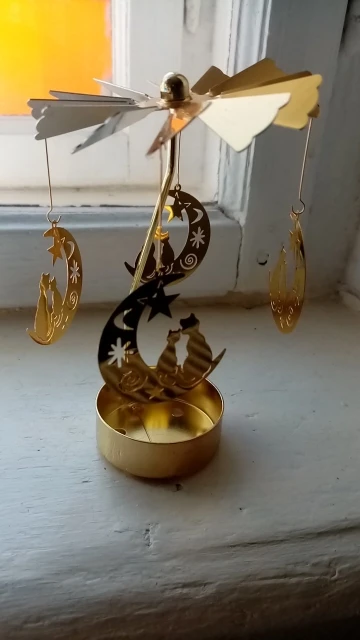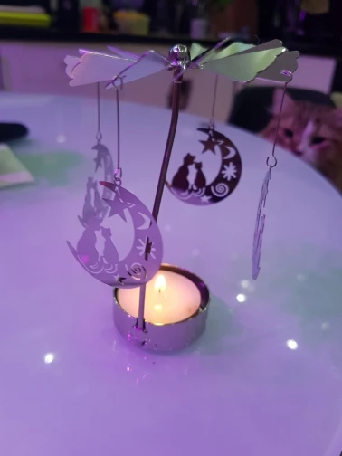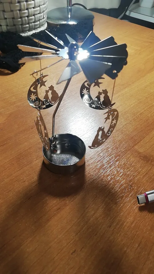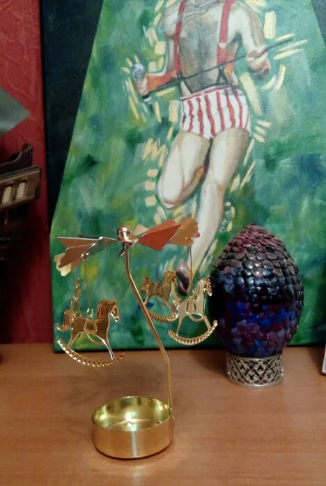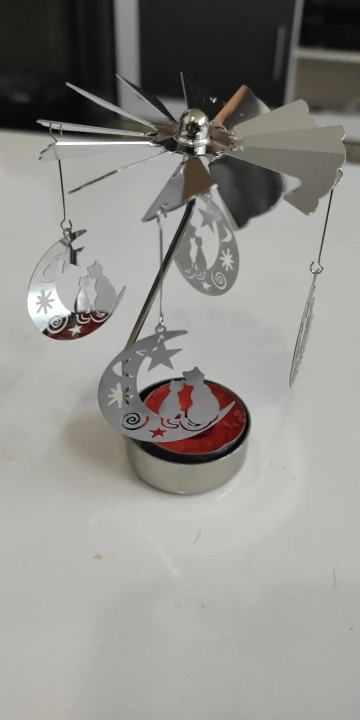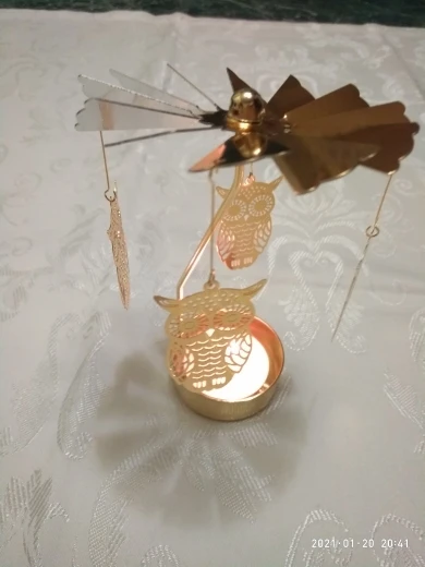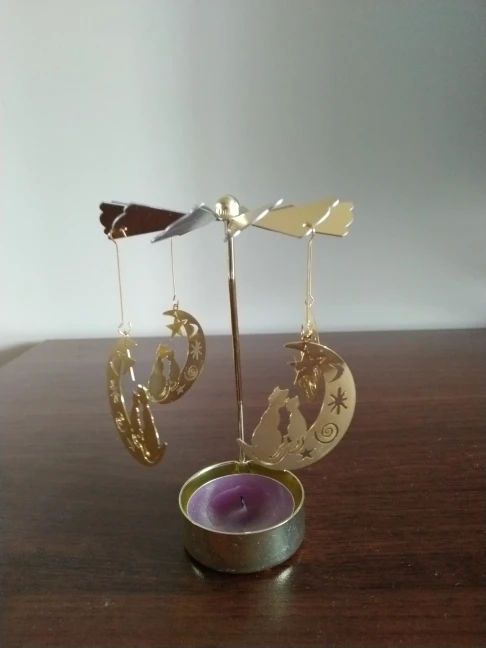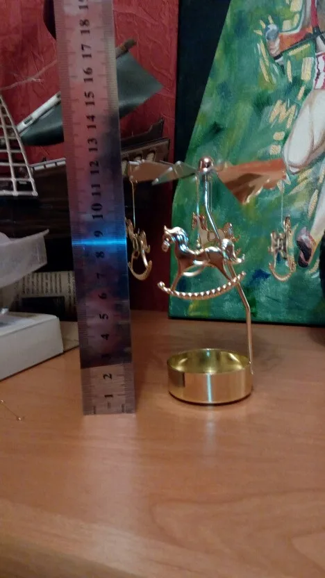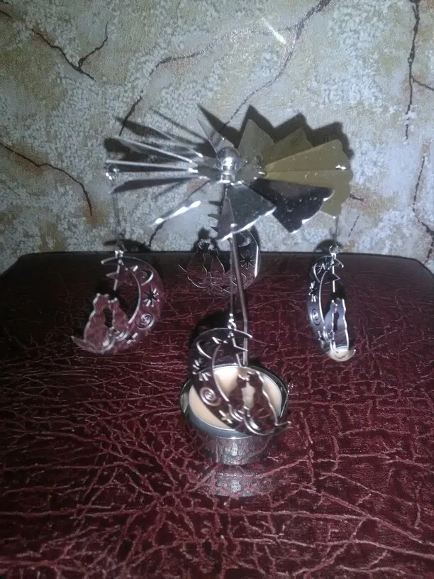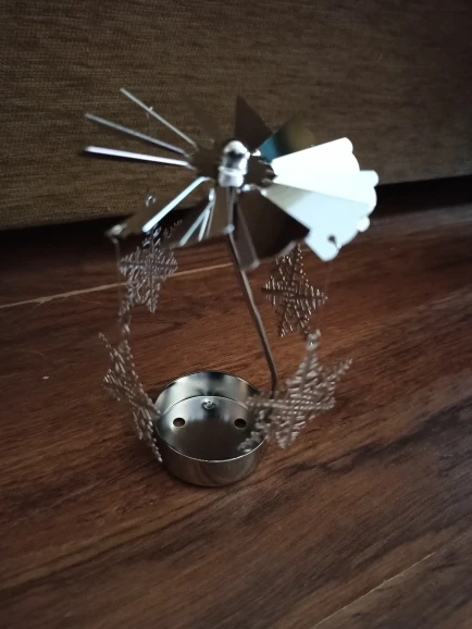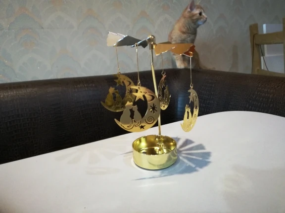 Отличный ретро-подсвечник, только дороговат и маловат - чуть меньше 13 см в высоту, диаметр вертушки - 8 см. У нас был когда-то такой большой, на 4 свечи, стоил копейки. Удовольствие получили, создаёт движущиеся тени на потолке и стенах.