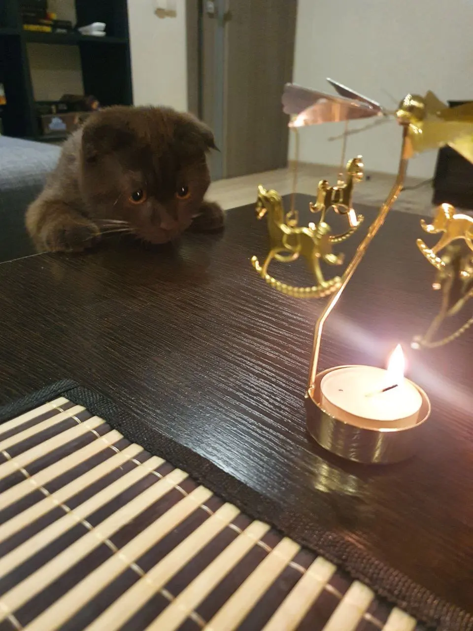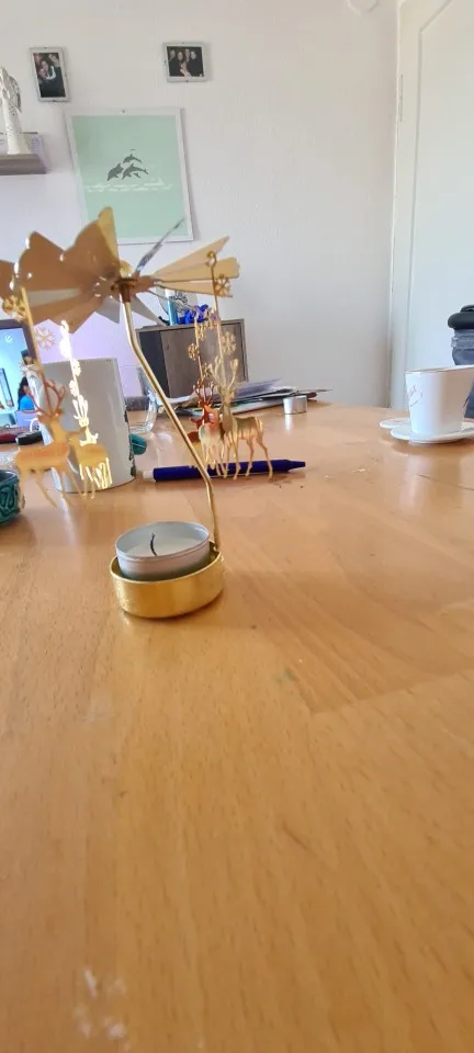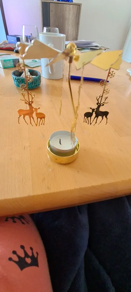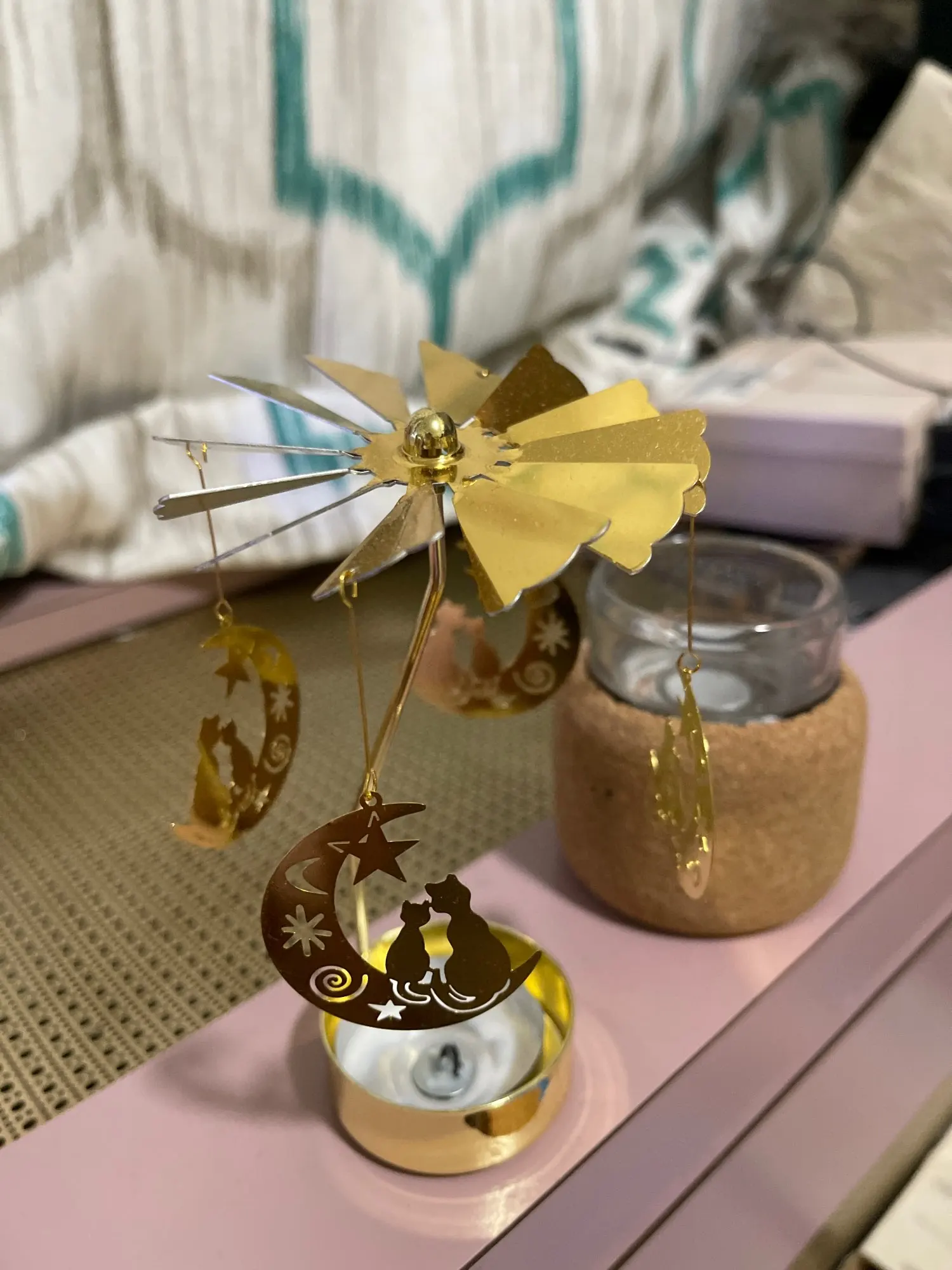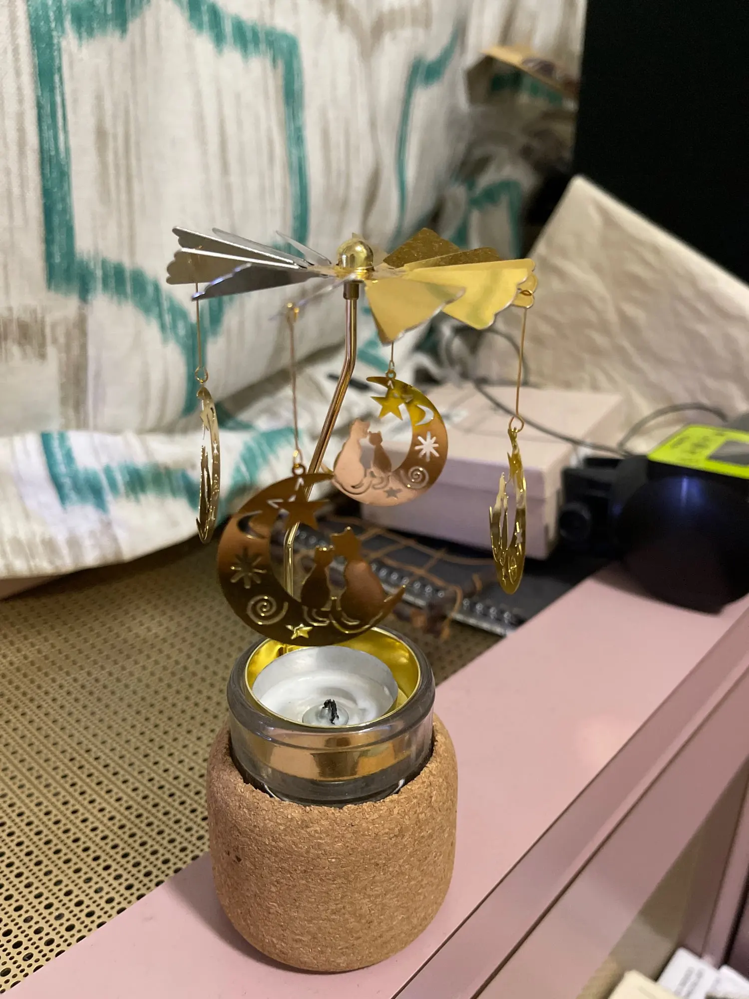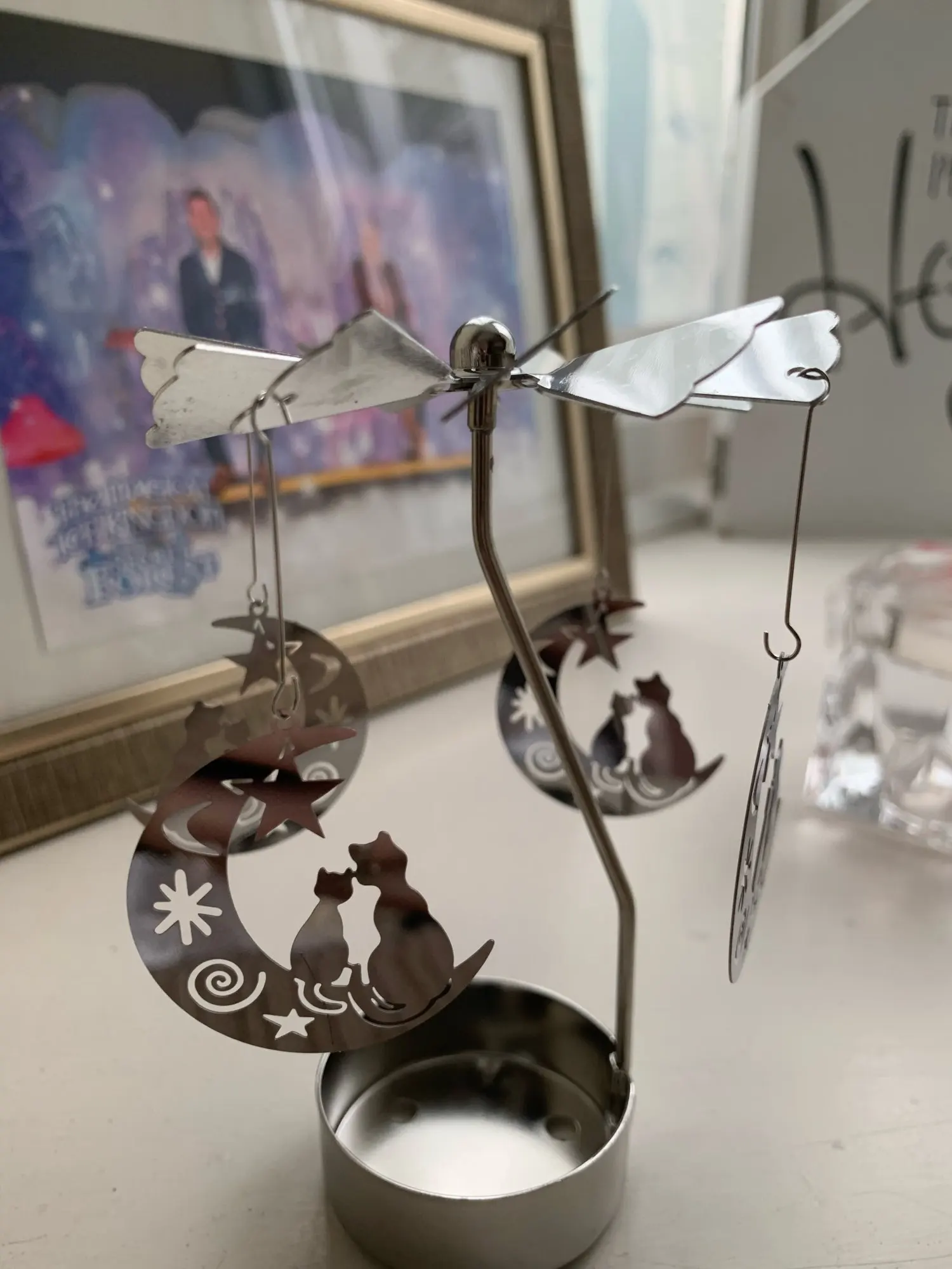 Отличный ретро-подсвечник, только дороговат и маловат - чуть меньше 13 см в высоту, диаметр вертушки - 8 см. У нас был когда-то такой большой, на 4 свечи, стоил копейки. Удовольствие получили, создаёт движущиеся тени на потолке и стенах.