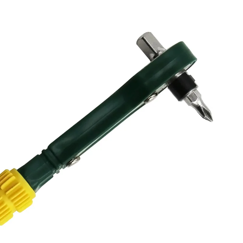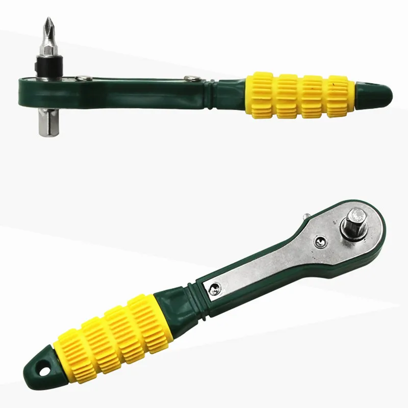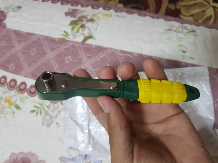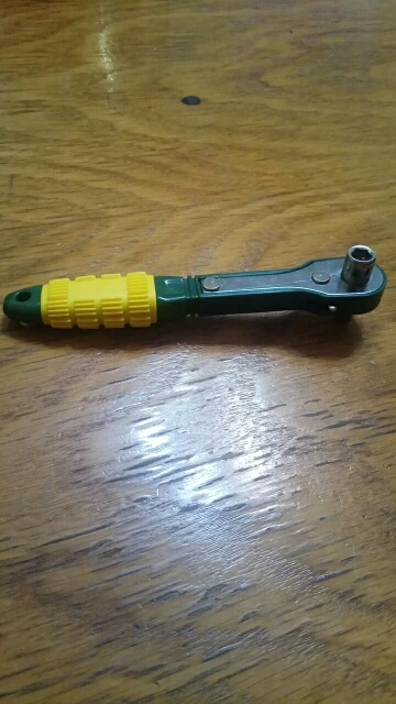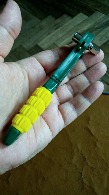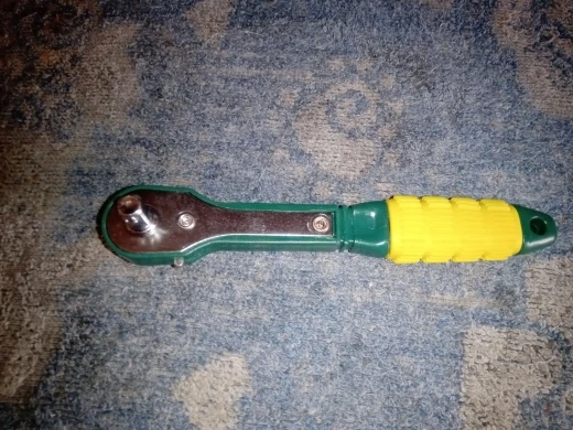 Получил всё в сохранности. Ключ в рабочем состоянии, трещетка срабатывает в обе стороны. Рукоятка из пластика. Жёлтая вставка из резины. В руке лежит очень удобно. Для не фанатичного и не частого использования самое то. Покупка обошлась менее одного рубля, так как попал на какую то акцию.