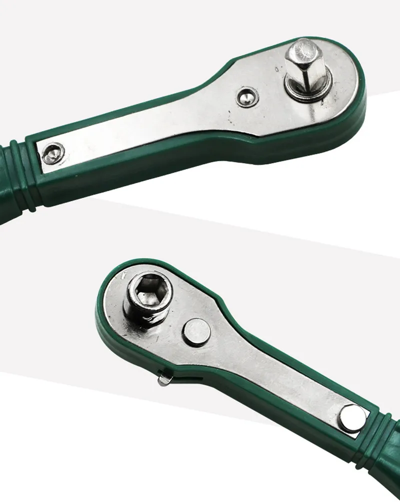 Корпус из жёсткого пластика, механизм металлический, трещотка без фиксации - при использовании приходится флажок трещотки удерживать пальцем, иначе не цепляется, прокручивается. Неудобно. Может быть мне бракованная попалась, а может так задумано. Корпус неразборный - на заклёпках. В целом - дешёвая игрушка, которую не жалко бросить, где попало. Использую для затяжки червячных хомутов на шлангах, чтоб не таскать хорошую трещотку из набора инструмента.