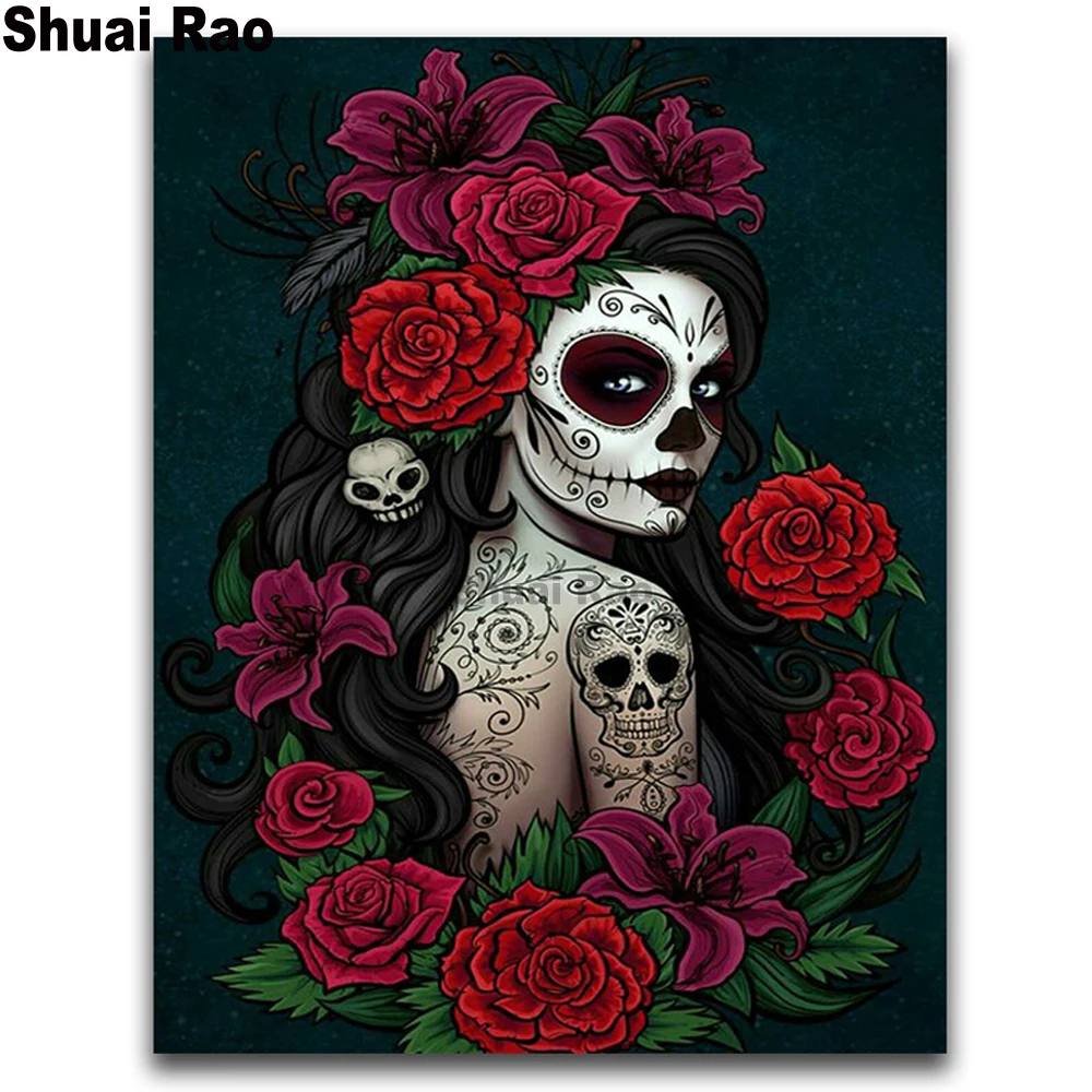 Картина из круглых Страз "сделай сам", с изображением розы, черепа, девушки, вышивка крестиком 5D, алмазная вышивка, мозаика, фэнтези-арт, тату, женщина,