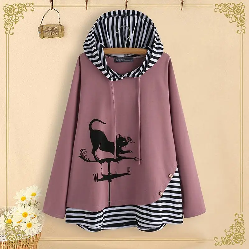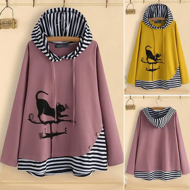 Модные полосатые толстовки с котом, Повседневный пуловер, свитшот, ...