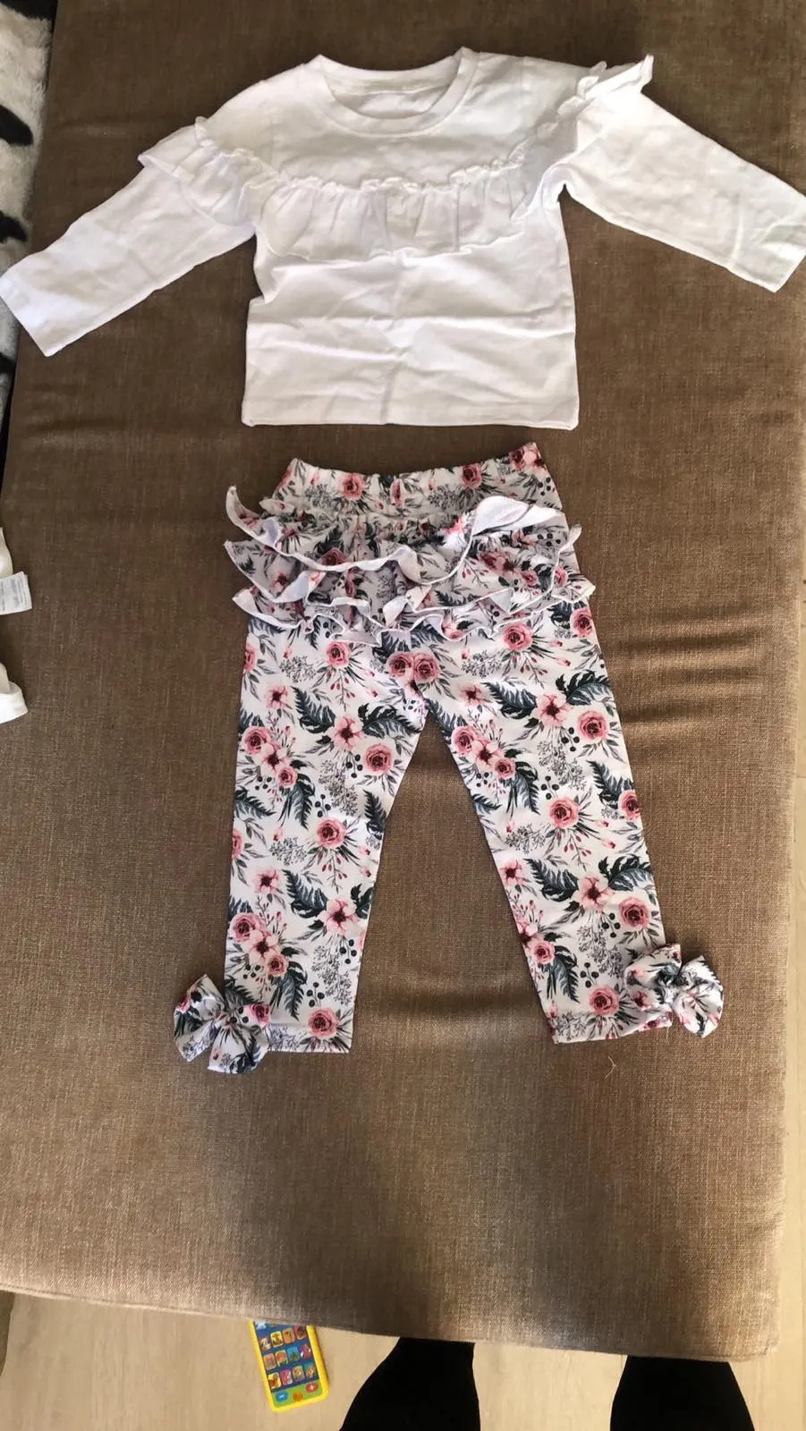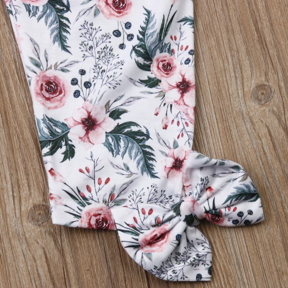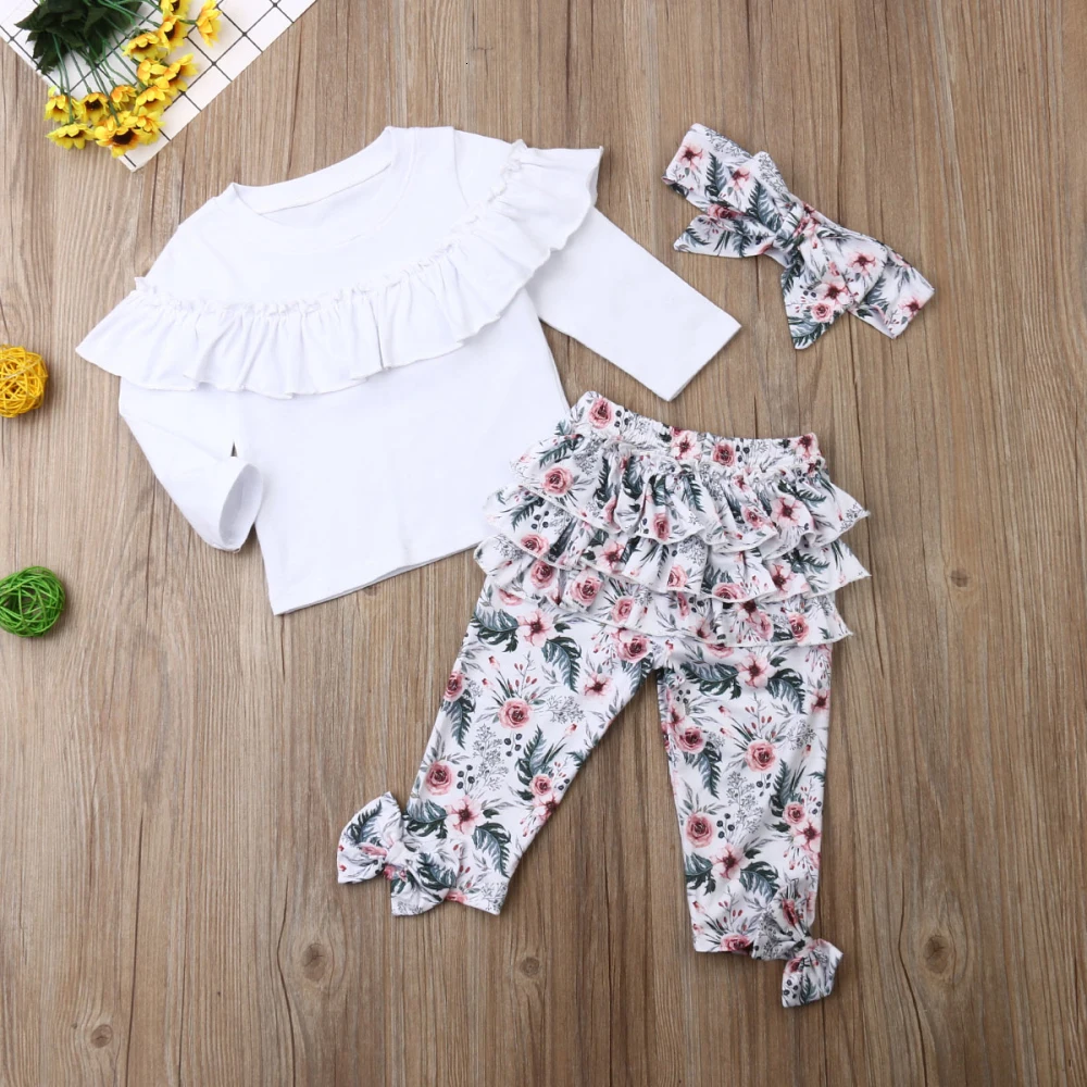 Комплект одежды для малышей, однотонный топ, штаны с принтом для девочек, топ с оборками и цветочным рисунком, леггинсы, комплект одежды из 3 предметов, От 1 до 5 лет