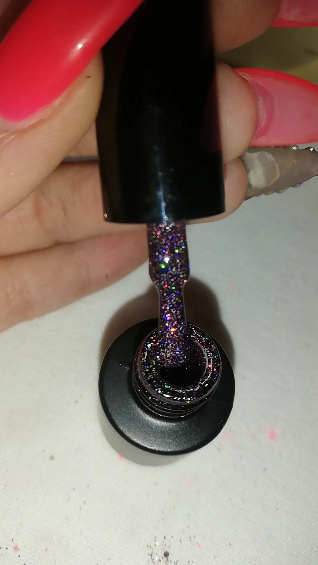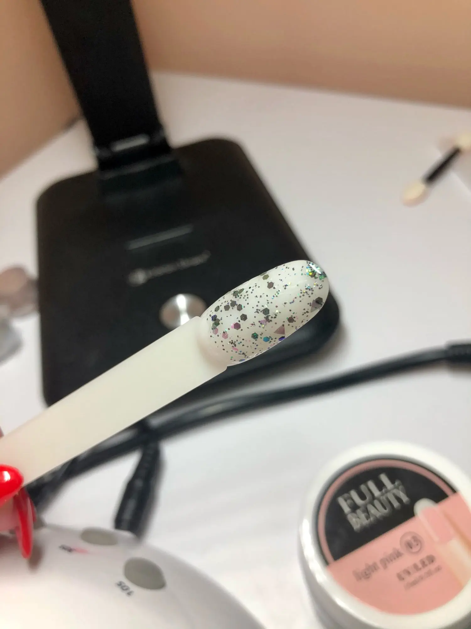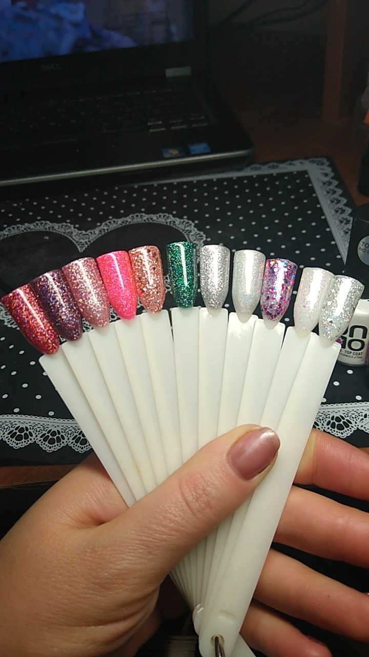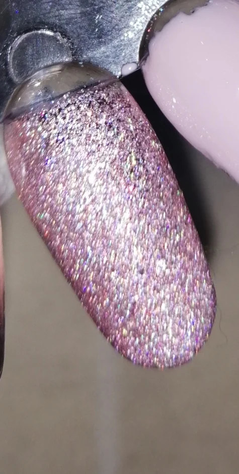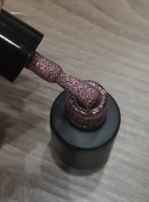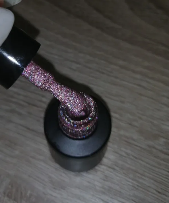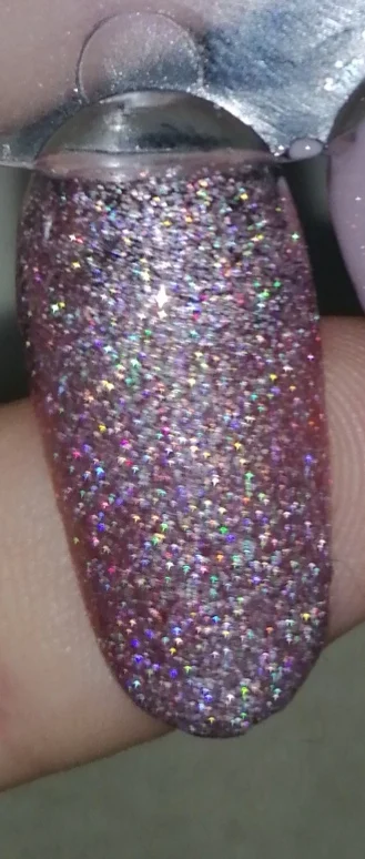 Доставка очень долгая, но оно того стоит гель-лак шикарен, это витражная розовая база с множеством голографических блёсток. для полного перекрытия необходимо либо 3 слоя, либо подложка+2 слоя. К сожалению, фото не передаёт всей красоты и переливов