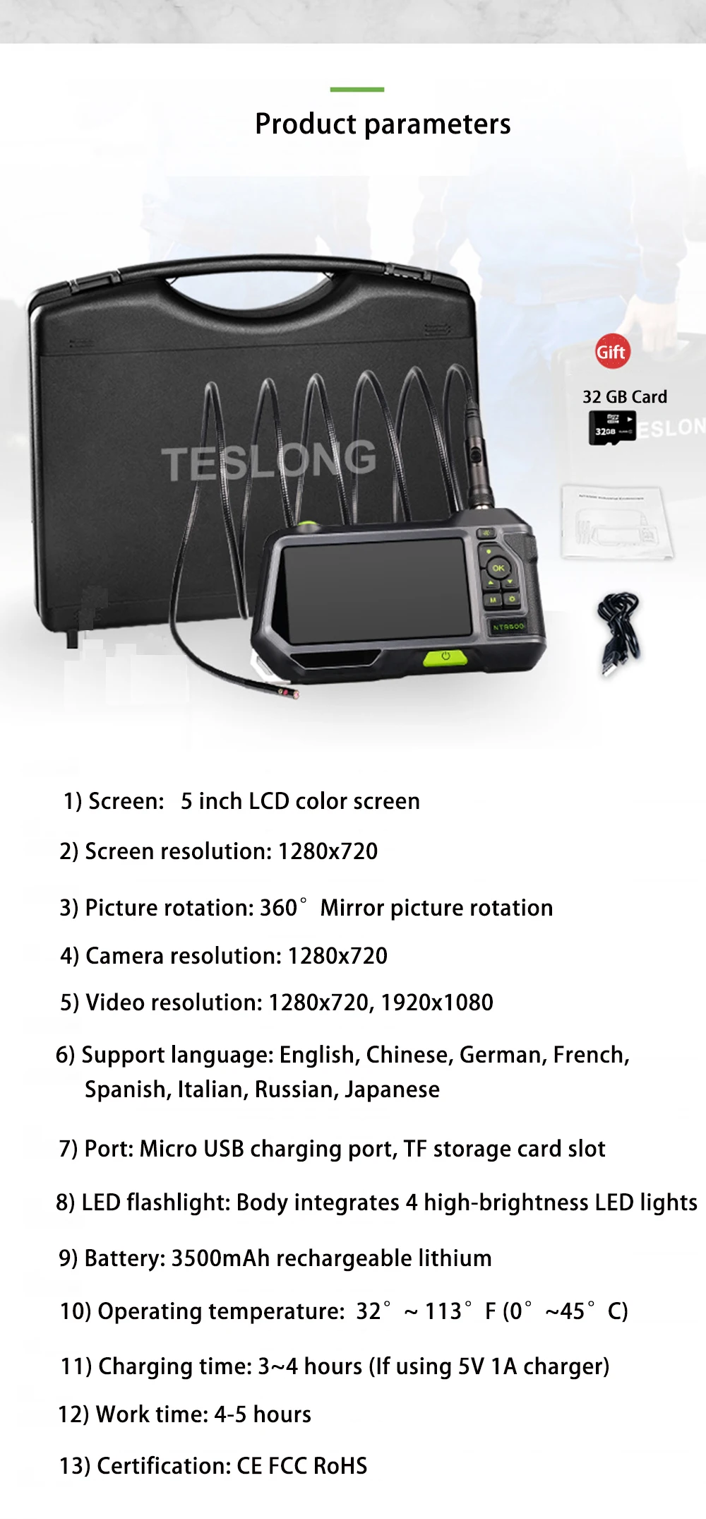 Монитор:Тип экрана: 2,8-дюймовый цветной экранРазрешение: 1920*1080 пикселей (QVGA)Вращение: 360 °Разрешение камеры: 1920*1080Разрешение фото: 1920*1080Разрешение записи: 1280*720Язык: английский. Китайский, немецкий, французский, испанский, итальянский, русский, японскийПорт: Порт удаленного подключения, USB, слот для карты TFSD-карта 32G TFКамера:Диаметр: 7,6 мм/5,5 мм/3,9 мм/12,5 мм на выборДиаметр вала: 7 мм/5 ммДлина голенища: 100 см/300 см/500 см (полу-жесткий кабель)Разрешение: 2,0 мегапикселейУгол обзора: 70 °Глубина резкости: 30 мм-60 ммИсточник светильник: 6 Регулируемых светодиодов высокой интенсивностиДругое:Светильник ная вспышка: 1 Вт CREE светодиодныйРабочая температура: от 32 ° до 113 °F (от 0 ° до 45 °C)Питание: литиевый аккумулятор 3500 мАч (в комплекте)Срок службы батареи: 4-5 часовСертификат: CE FCC ROHS