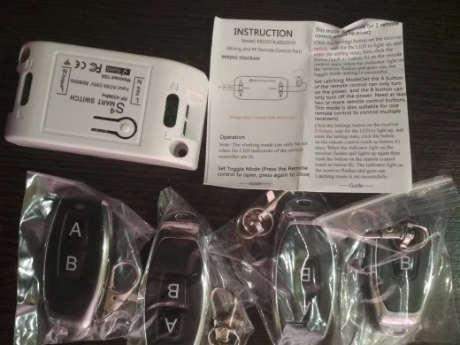 Режимы работы Вы можете настроить в 3 Режимах: Мгновенный режим, режим переключения и режим блокировки. Мгновенный режим: Нажмите и удерживайте кнопку,ЭтоРеле будет работать; Отпустите кнопку, это реле остановится. Режим переключения: Нажмите кнопку, реле будет работать; Нажмите кнопку снова,ЭтоРеле прекратится. Режим блокировки: Нажмите кнопку, реле будет работать; Нажмите кнопку B снова,ЭтоРеле остановится, второе реле будет работать. Как настроить Мгновенный режим: Нажмите кнопку обучения один раз, нажмите кнопку один раз, добиться успеха. Режим переключения: Нажмите кнопку обучения дважды, нажмите кнопку один раз, добиться успеха. Режим блокировки: Нажмите кнопку обучения 3 раза, нажмите кнопку один раз, добиться успеха. Чистые данные: Нажмите кнопку обучения 8 раз, данные будут очищены. Все пульты не могут контролировать этот приемник. Если вы хотите изменить режимы, вам нужно сначала очистить данные.