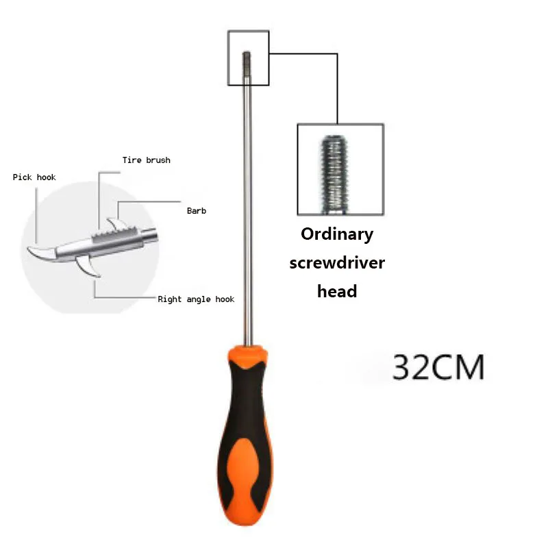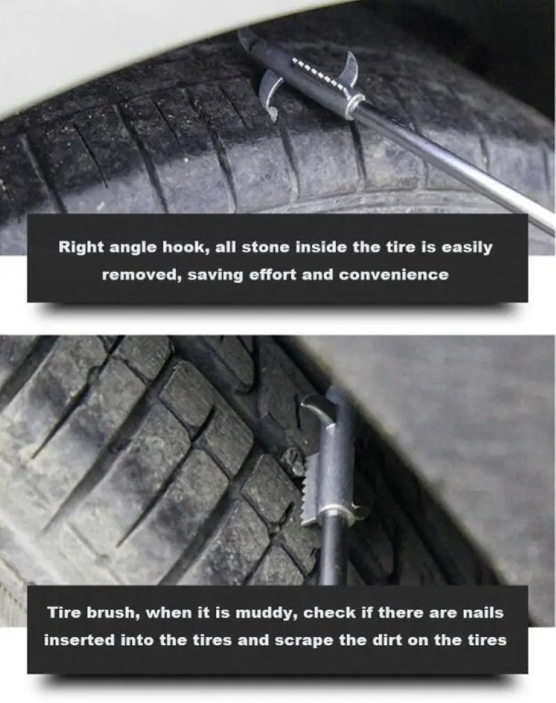 3. Профессиональный дизайн с тремя различными направлениями крючков и кистей для шин, подходящая длина, нескользящая ручка, позволяет очищать камень для шин более удобным и экономичным.
