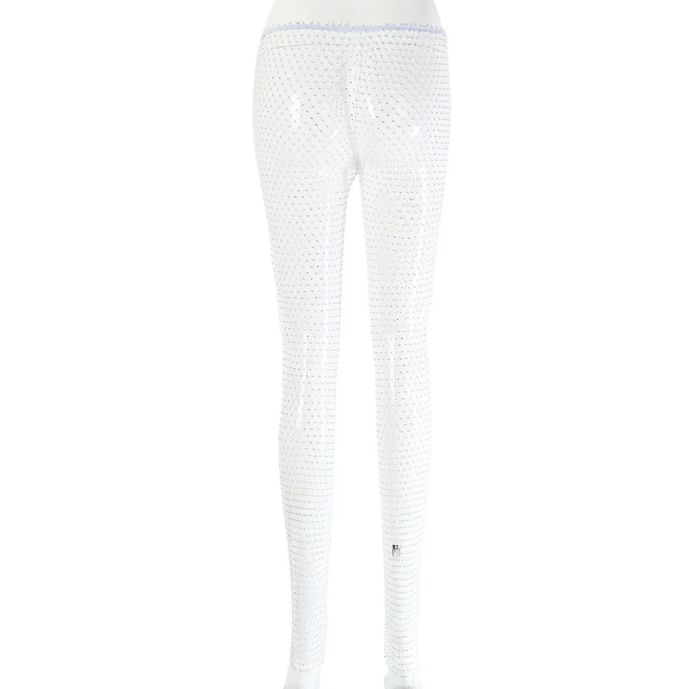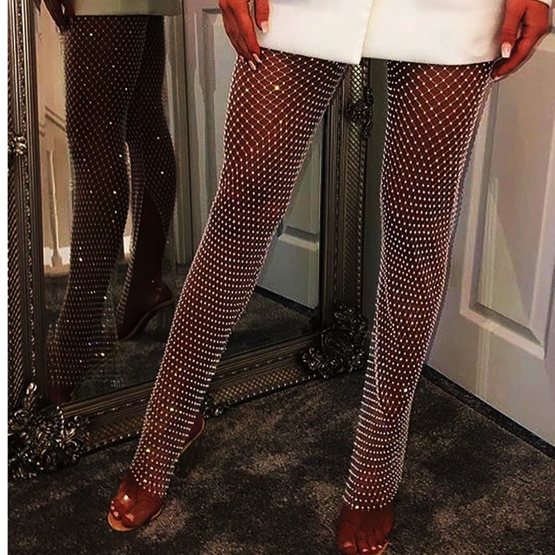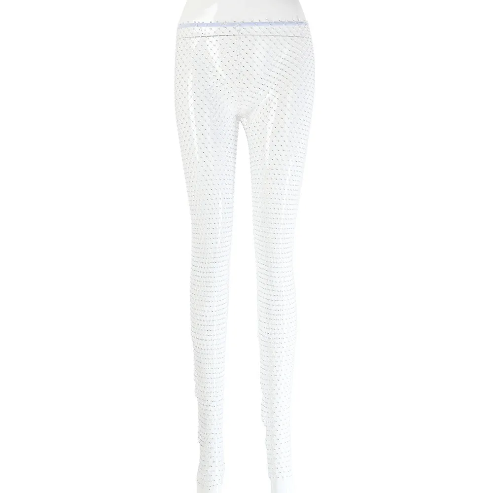 Блестящие женские брюки в сеточку со стразами, летние сексуальные эластичные ажурные Брюки в сеточку, Модные прозрачные брюки