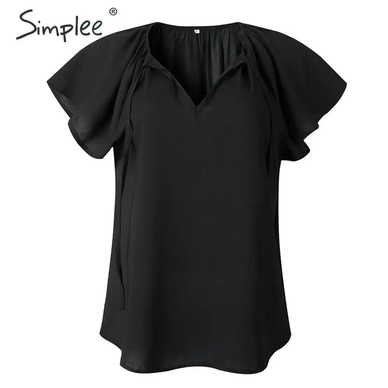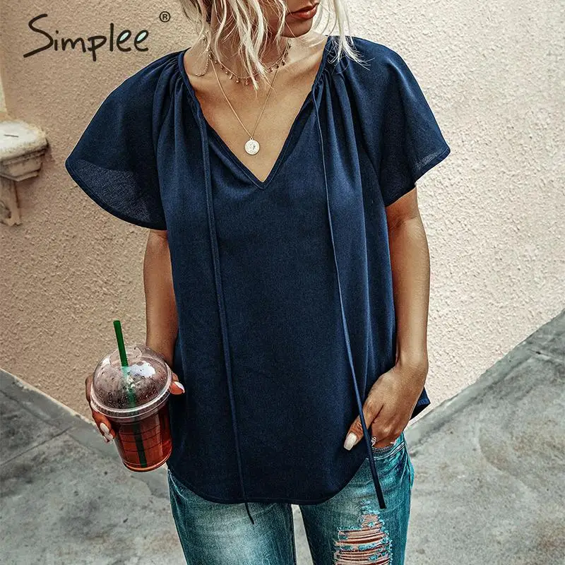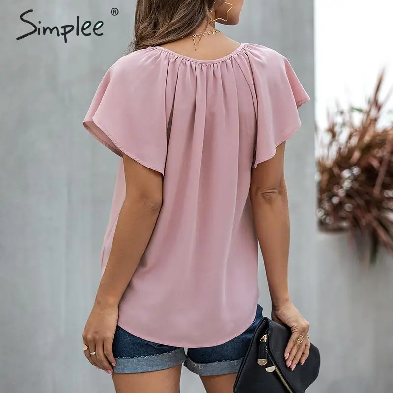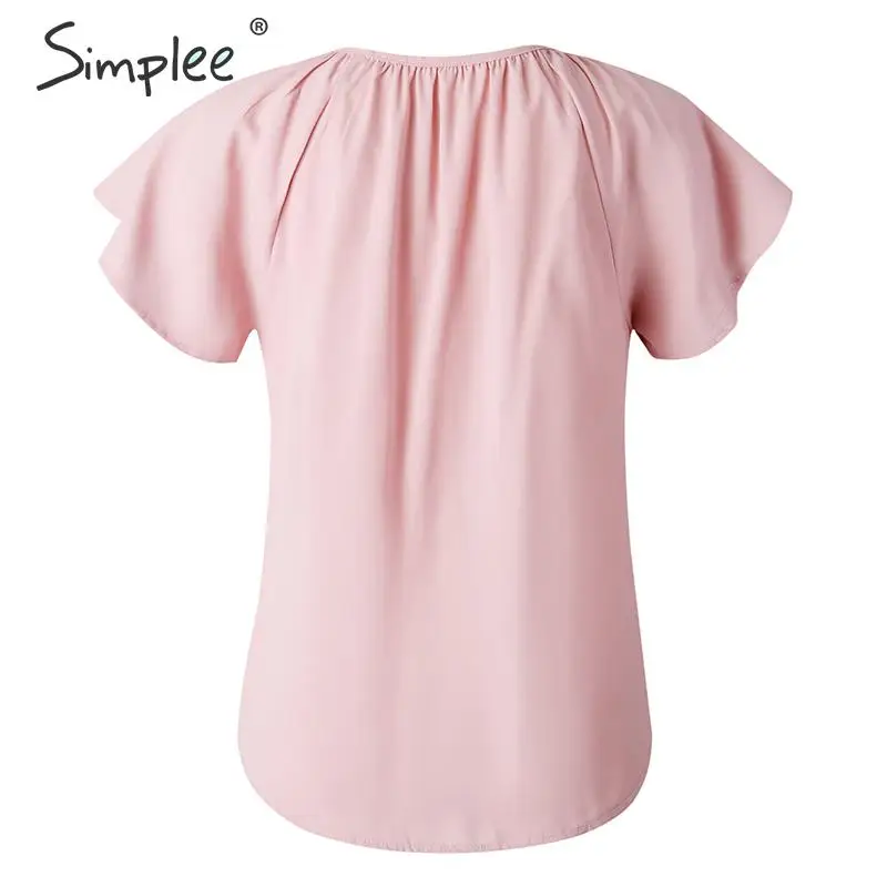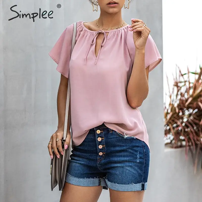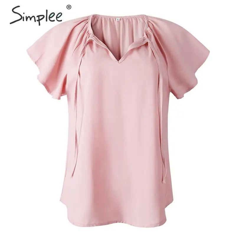 Простая Летняя Повседневная розовая однотонная блузка, женская блузка с коротким рукавом, элегантная офисная блузка с v-образным вырезом