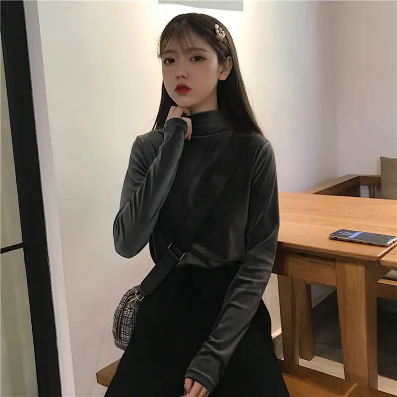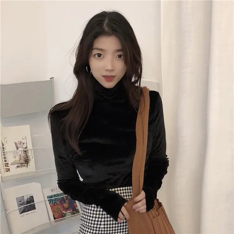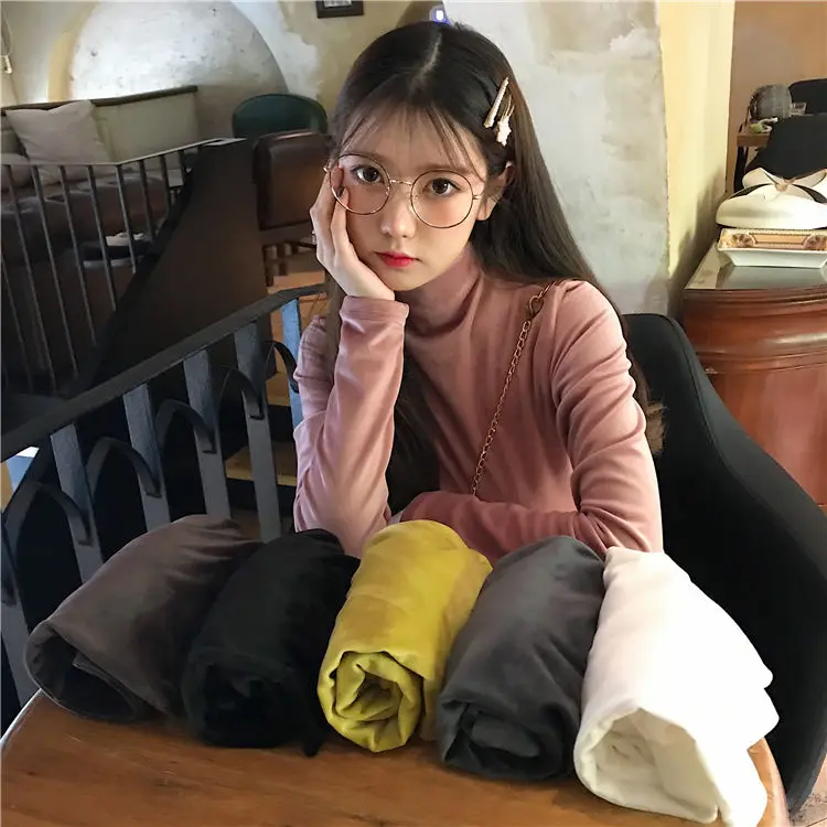 Осенне-зимняя Вельветовая Однотонная рубашка с высоким воротником и рисунком лисы, облегающая кофта с топом и плюшевой подкладкой, теплая женская футболка с длинными рукавами