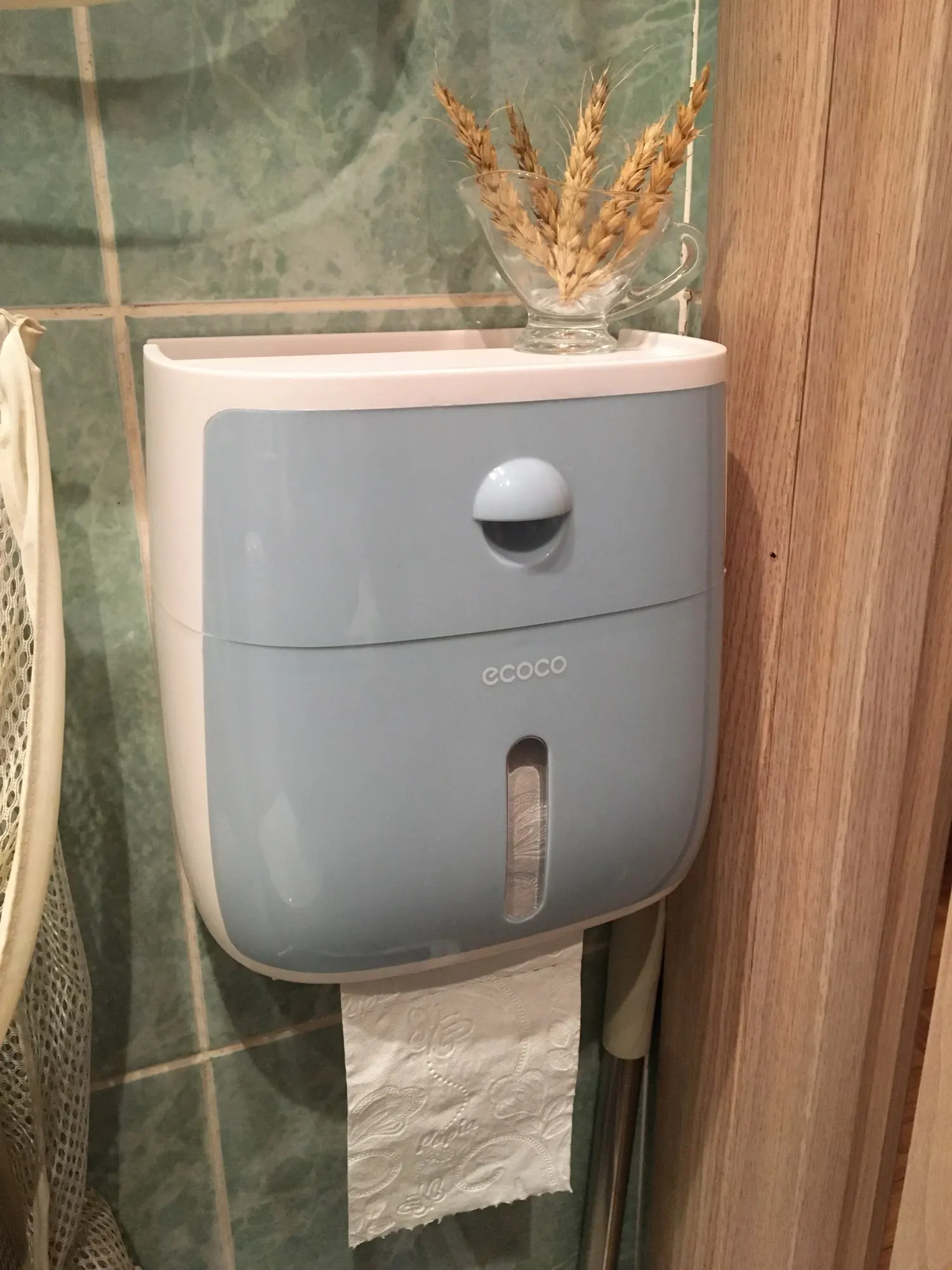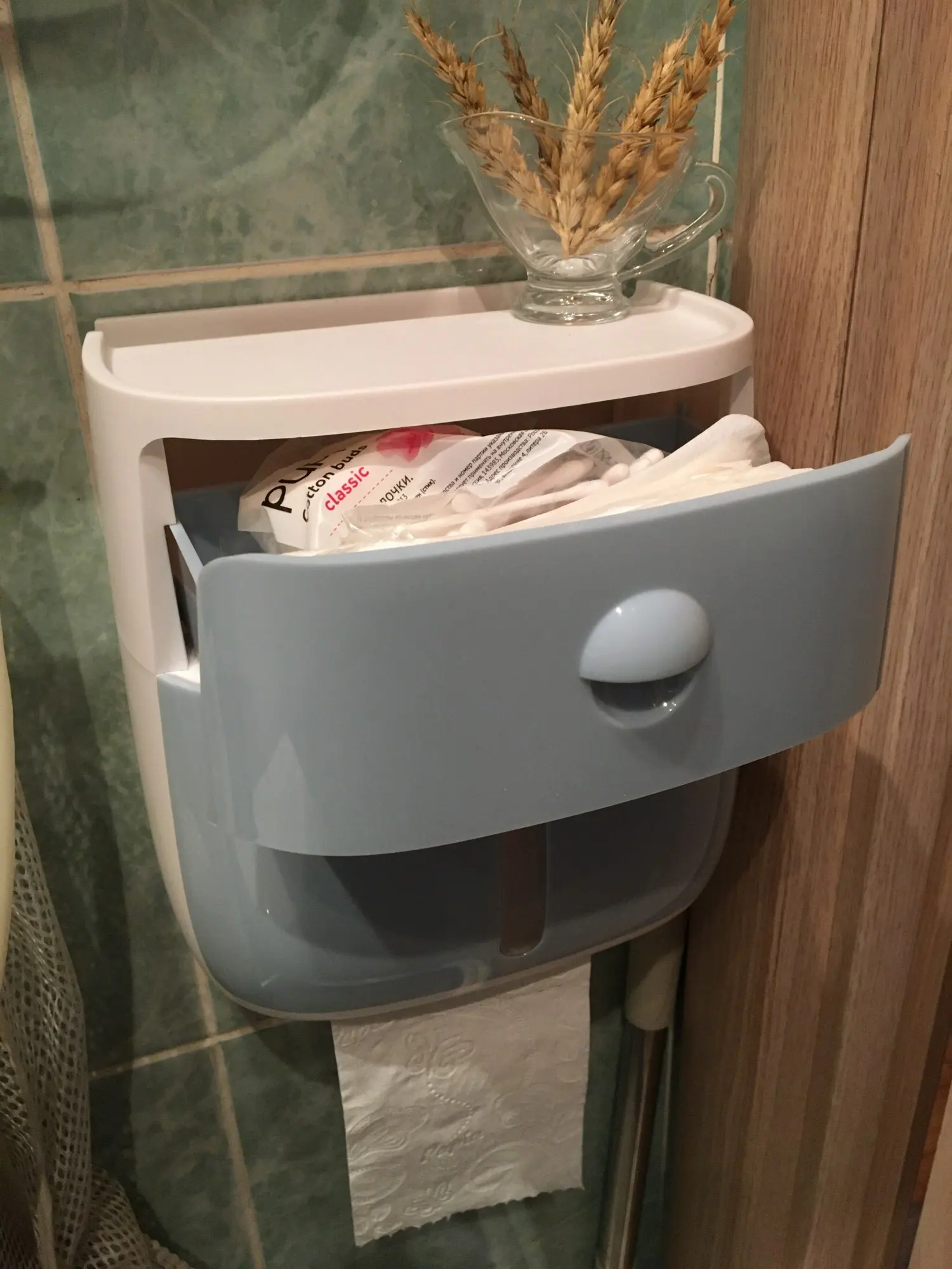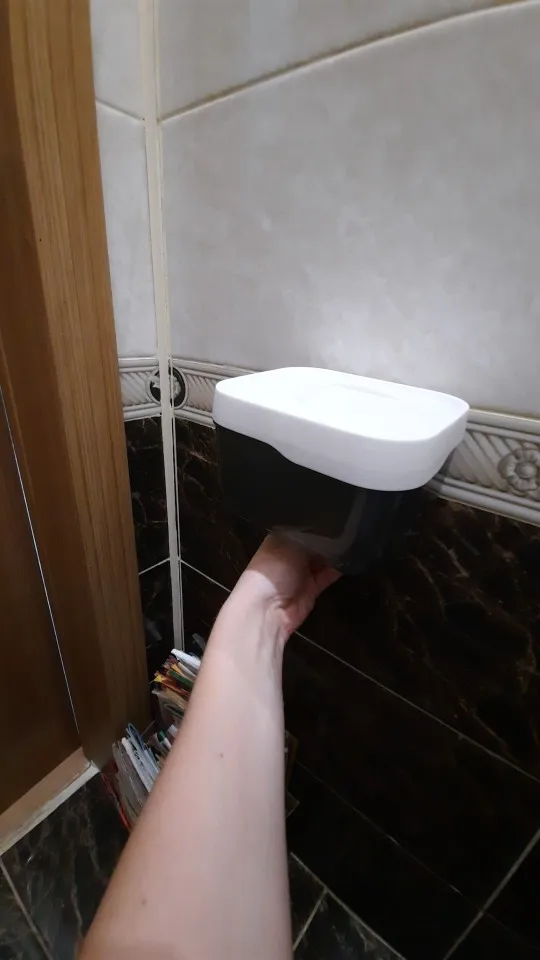 Отличный держатель, правда, немного меньше, чем ожидала. Крепила к стене на саморезы. В верхний ящичек помещается пачка влажных салфеток.