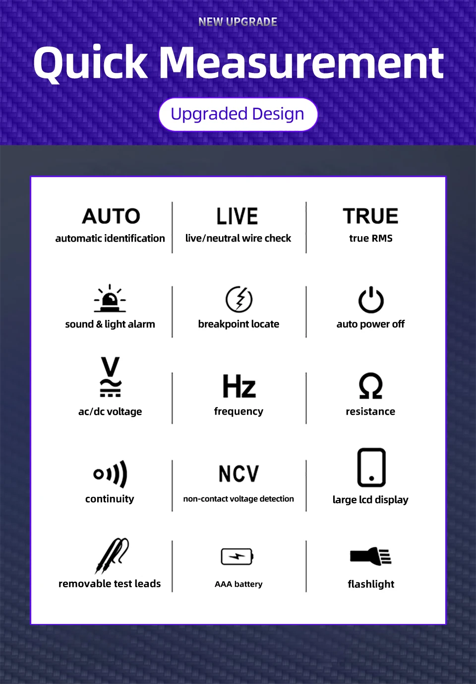 1. Бесконтактный и тонкий дизайн, удобный в эксплуатации и переноске.2. Супер-чистый дисплей EBTN, прозрачный и легко читаемый.3. Два режима работы. (низкая чувствительность и высокая чувствительность)4. С индуктивной опасной сигнализацией напряжения, различием между живыми и нейтральными линиями, позиционированием в реальном времени, проверкой непрерывности, функцией фонарика и т. д.5. ЖК-дисплей и светодиодный индикатор с двумя подсказками-опасное напряжение с первого взгляда.6. С 8 светодиодный индикаторами в 3 цветах (красный/желтый): Автоматическая идентификация высокого/среднего/низкого напряжения.7. Режим сигнализации: звук, аналоговая полоса и светильник (красный/желтый).8. Двойной изоляционный материал тела значительно улучшает стандарт безопасности, чтобы защитить вас от электрического удара.9. Уровень безопасности: CAT II 600V.10. Напоминание о низком напряжении батареи, функции автоматического отключения питания.