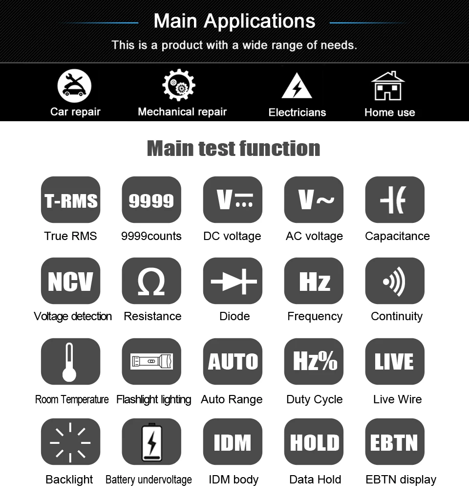 Дисплей: 9999 подсчетов.Экран: 3,5 дюймов.DC Напряжение: 0,8 V-620V ±(0.5% + 3); Разрешение: 0,001 V.AC Напряжение: 2,2 V-620V ±(0.5% + 5); Разрешение: 0,001 V.Сопротивление: 1Ω-999.9Ω ±(2.0% + 5); 1k60-60mΩ ±(1.0% + 3); Разрешение: 0.11Ω.Емкость: 1nF-999.9nF ±(6.0% + 5); 1uF-99.99mF ±(3.0% + 3); Разрешение: 0.001nF.Частота:1 Гц-1000 Гц ±(1.0% + 5) (переменный ток: 2 в-10 В); Разрешение: 0,001 Гц.1 кГц-60 кГц ±(1.0% + 5) (переменный ток: 10 В-620 в); Разрешение: 0,001 Гц.Рабочий цикл: 0.1%-99.9% ±(3.0% + 5) (переменный ток: 2 в-620 в); Разрешение: 0.1%.Диод: Автоматическое определение диода в тех случаях, когда менее чем 3,0 V.V-оповещение (Бесконтактное Обнаружение напряжения): звуковой сигнал.Проверка в режиме реального времени: звуковой сигнал тревоги, полоса дисплея ЖК-экрана.Непрерывность: если сопротивление менее 30 Ом, звуковой сигнал.