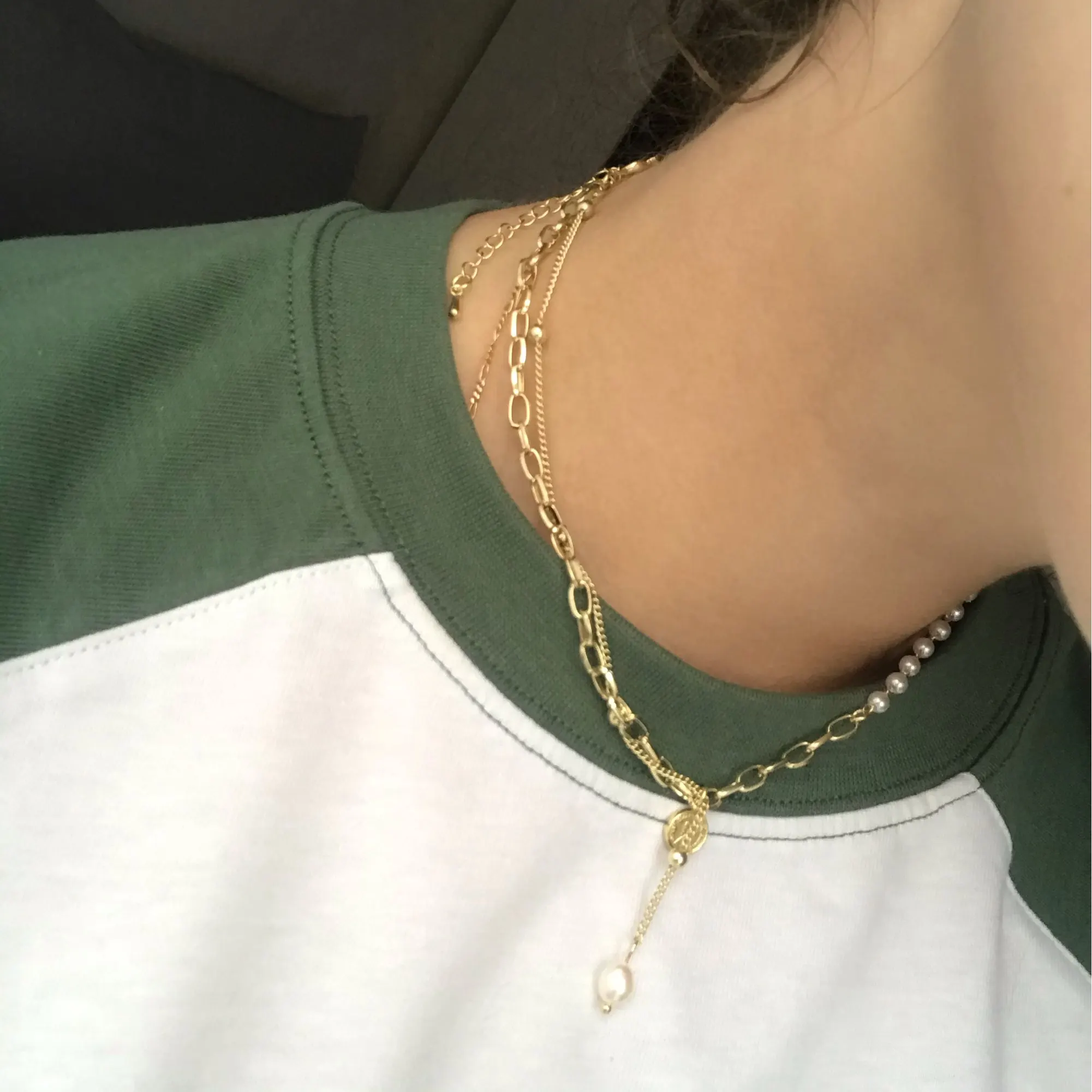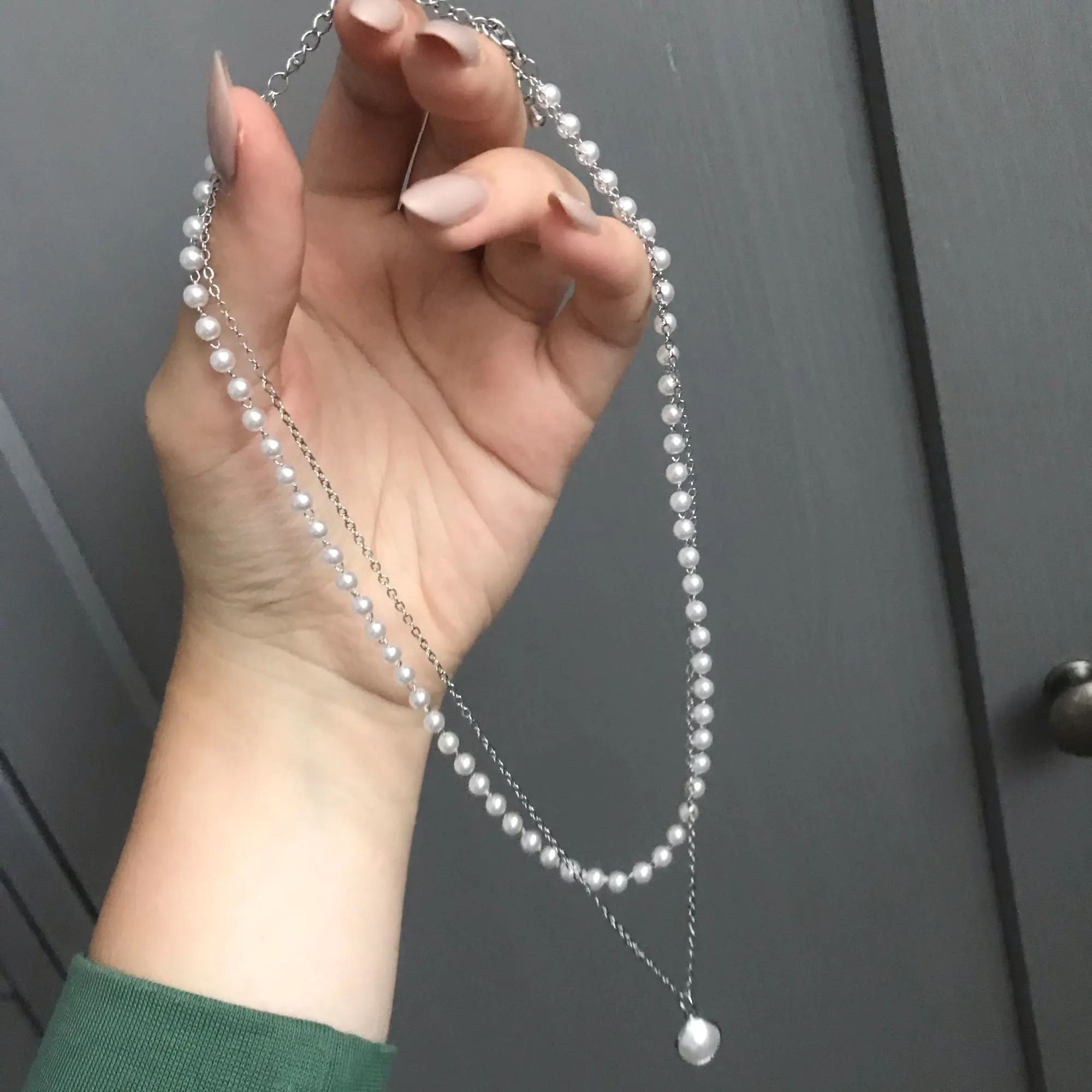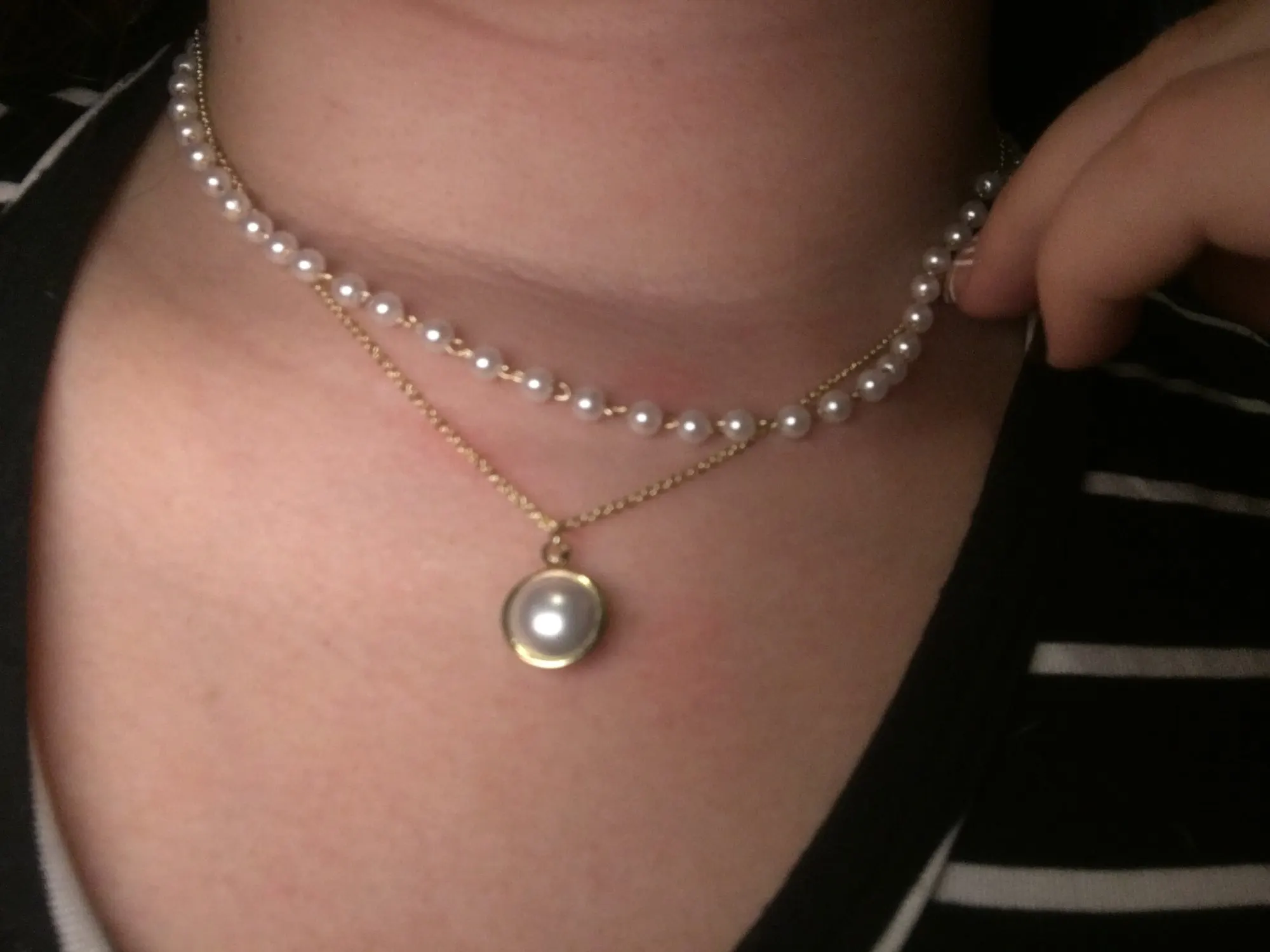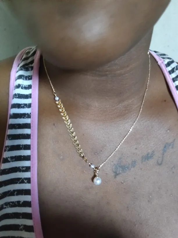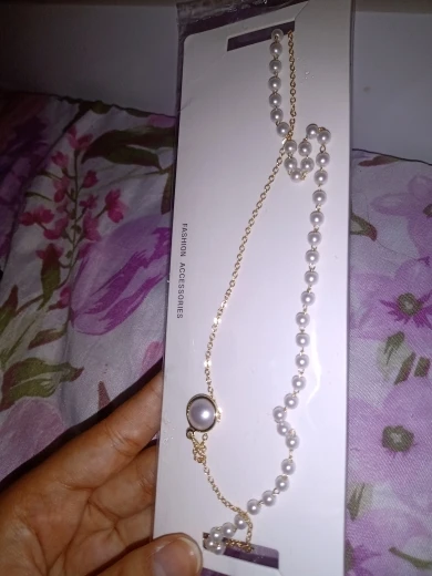 Это точно так же, как на фотографиях! Мне не нравится длинное ожерелье (они прикреплены друг к другу), поэтому я просто отрезала его, и теперь это милый чокер с жемчугом, и он регулируется!