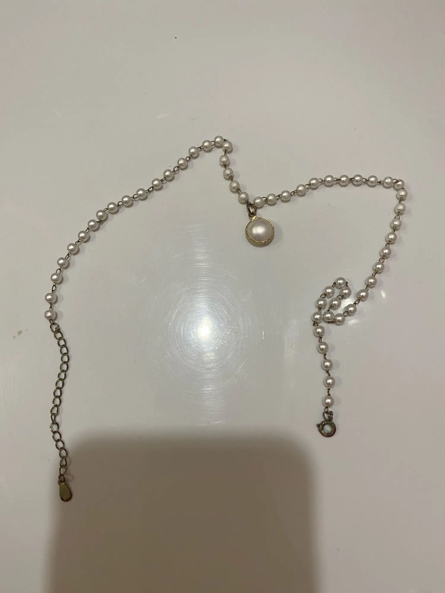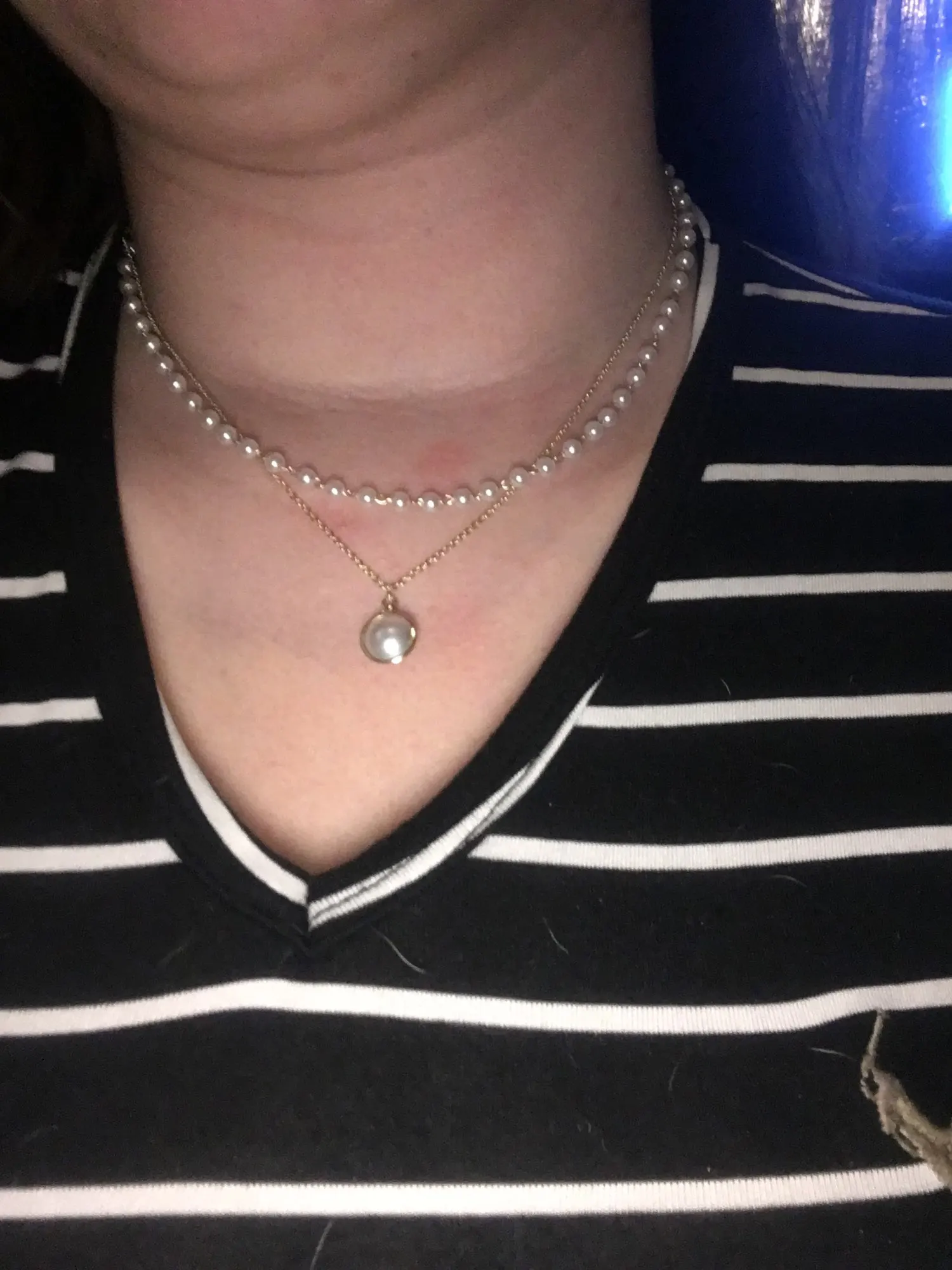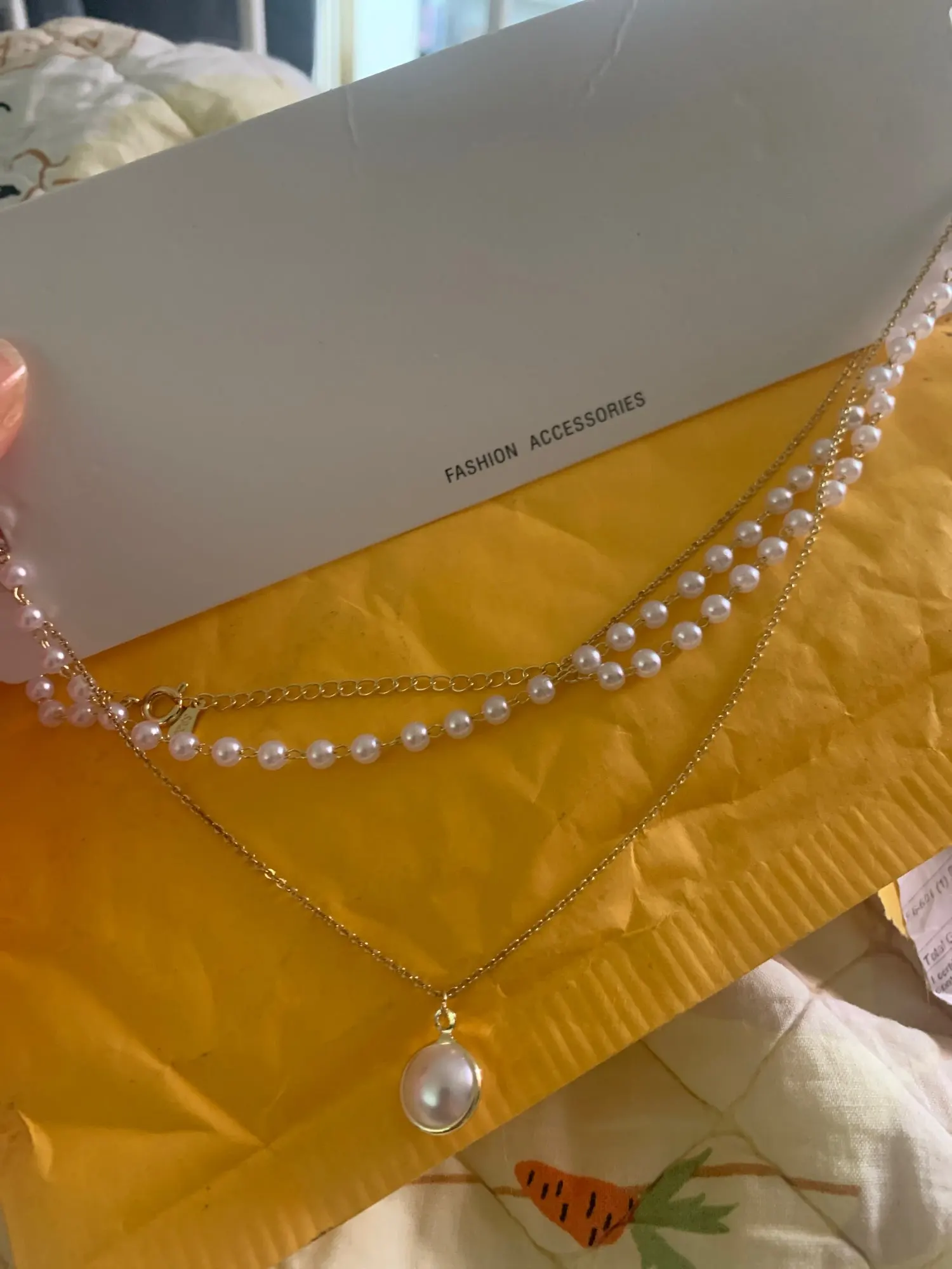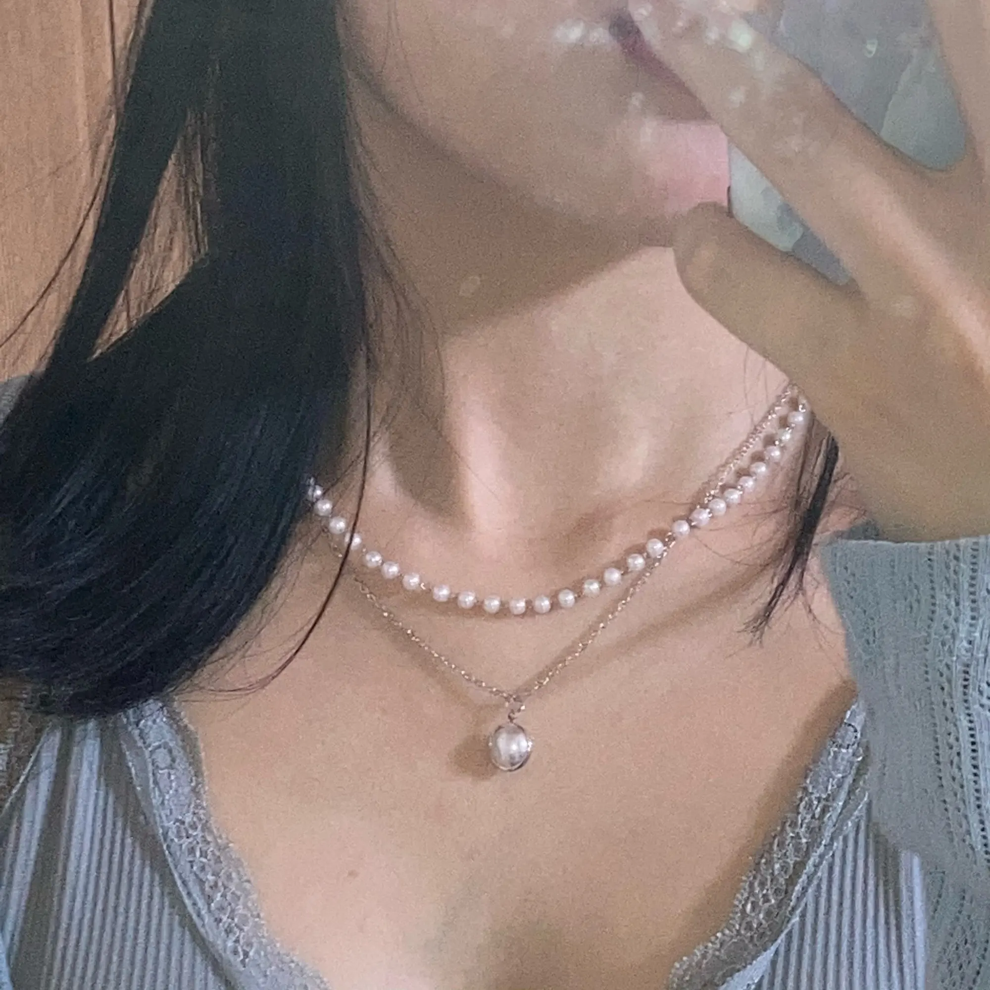 Это точно так же, как на фотографиях! Мне не нравится длинное ожерелье (они прикреплены друг к другу), поэтому я просто отрезала его, и теперь это милый чокер с жемчугом, и он регулируется!