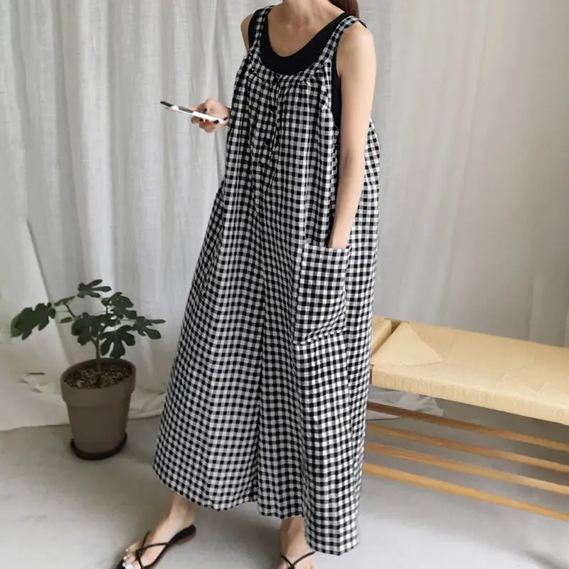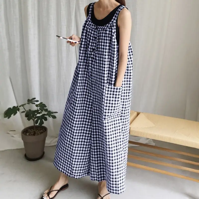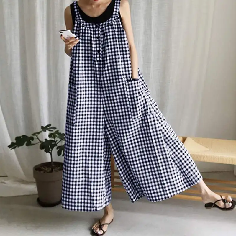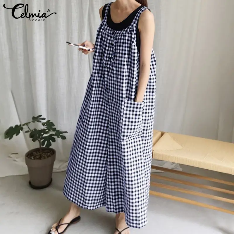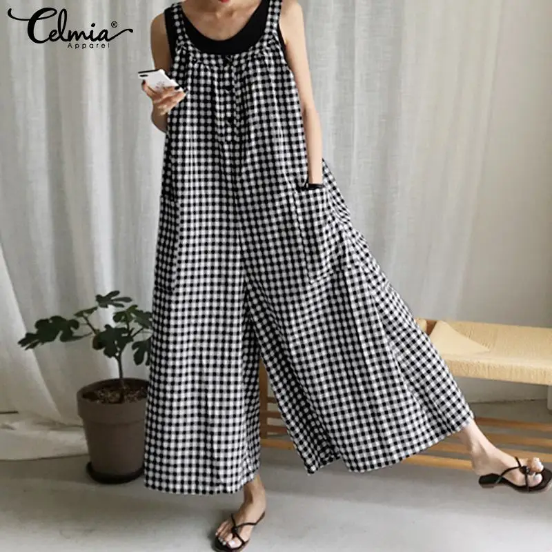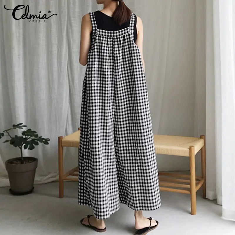 Celmia 2022 летние модные женские винтажные Длинные Комбинезоны в клетку с широкими штанинами, повседневные Свободные Комбинезоны без рукавов, богемные комбинезоны