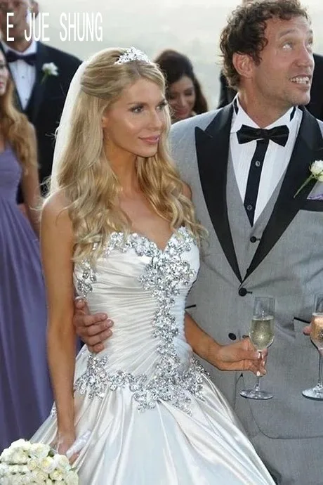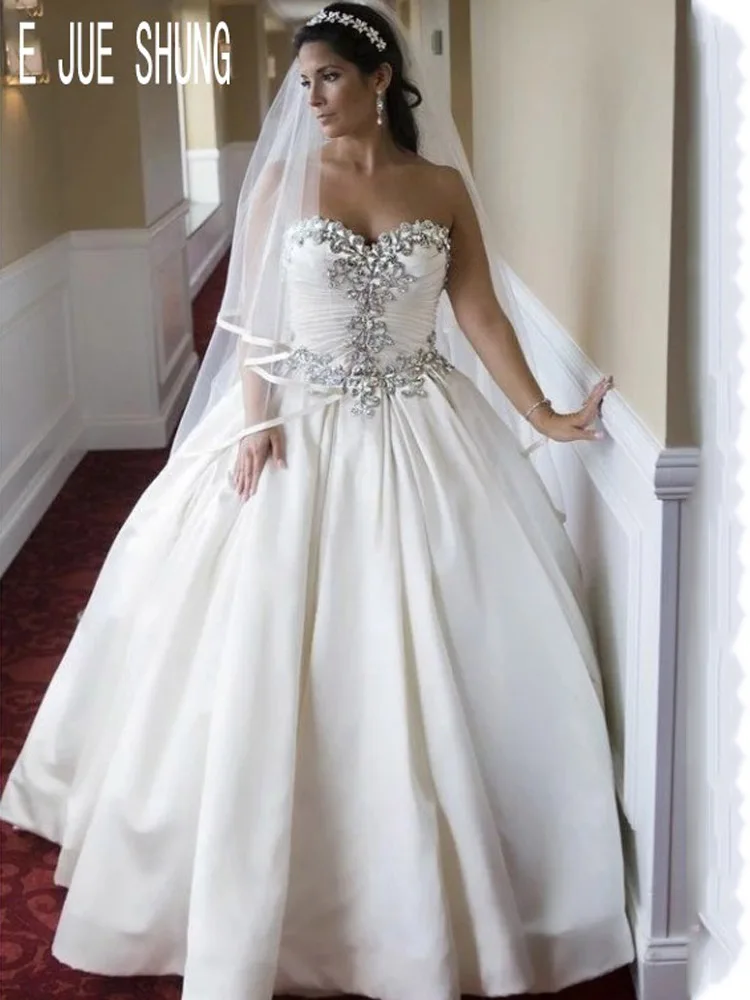 Роскошное Белое Атласное Бальное Платье E JUE SHUNG, свадебные платья с вырезом сердечком, свадебные платья со шнуровкой на спине с кристаллами, свадебное платье