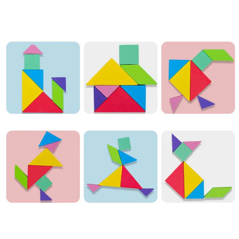 Tangram-это игра-головоломка, которая состоит из семи кусочков пазлов: пяти изоскелов, прямоугольных треугольников (два маленьких, один средний и два больших треугольника), одного квадрата и одного параллелограмма.