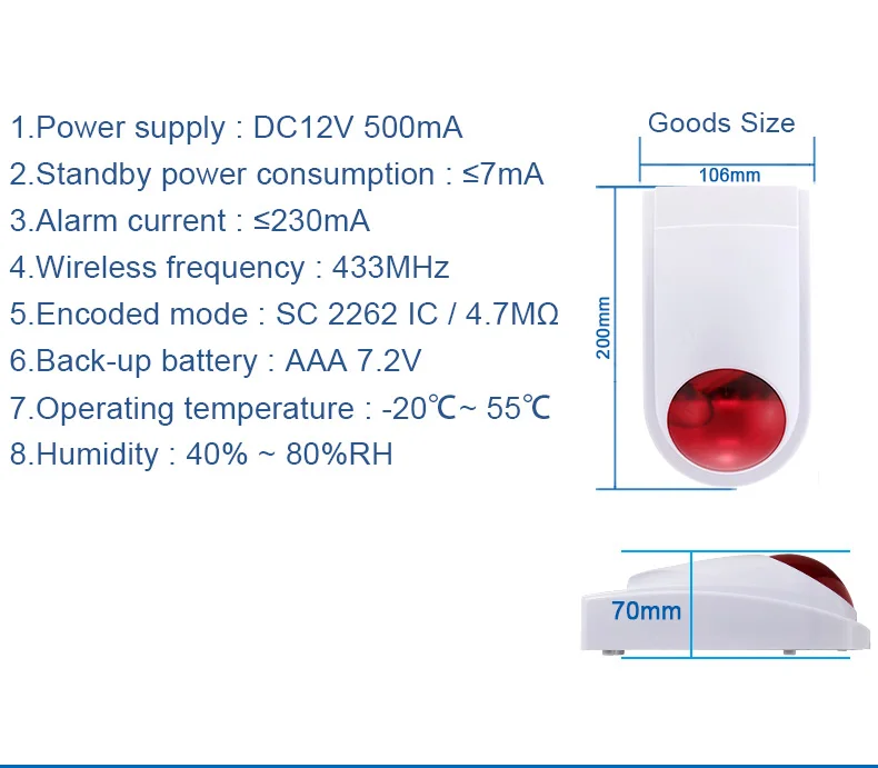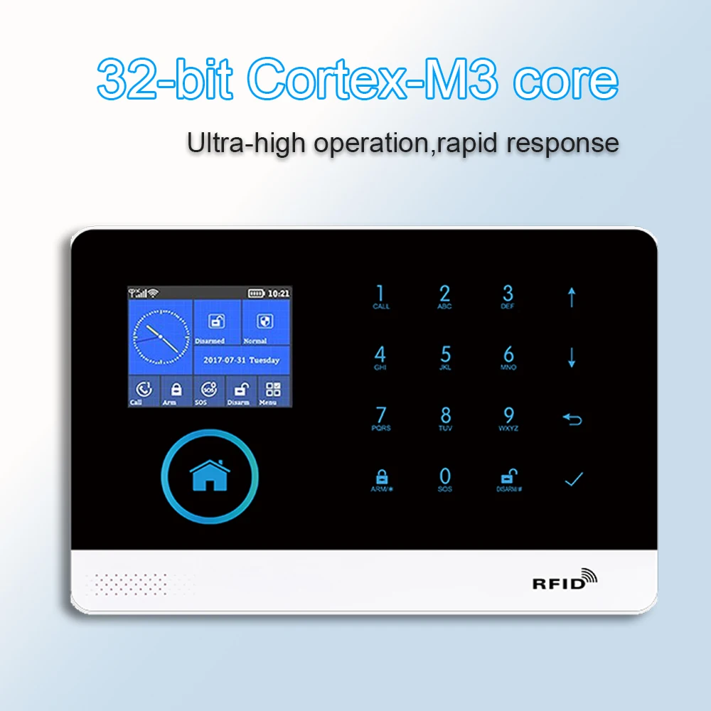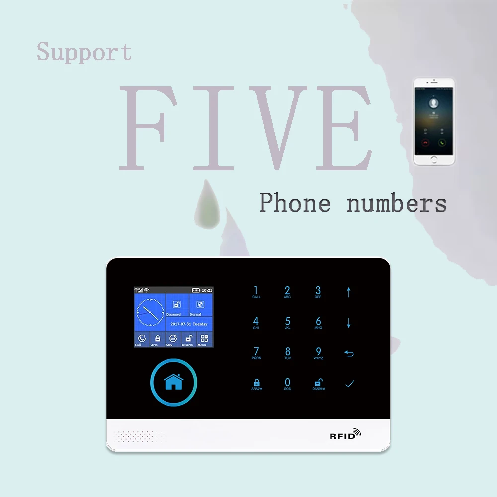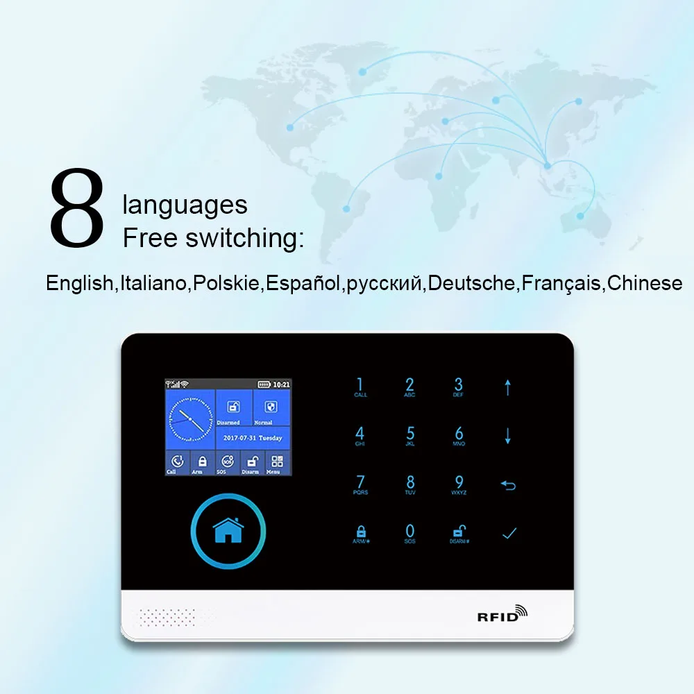 10. Поддержка зоны защиты s: ворота поддержки, SOS, спальня, окно, балкон, периметр, дым, газ, окись углерода, утечка воды.11. Ежедневные операции:Пульт дистанционного управления.Клавиатура.Удаленное SMS.Мобильный телефон app.Центр сигнализации GPRS.12. Поддержка 8 языков: английский, китайский, немецкий, итальянский, испанский, русский, польский и французский.