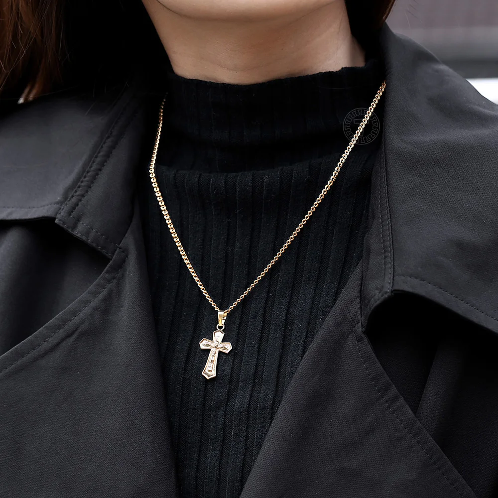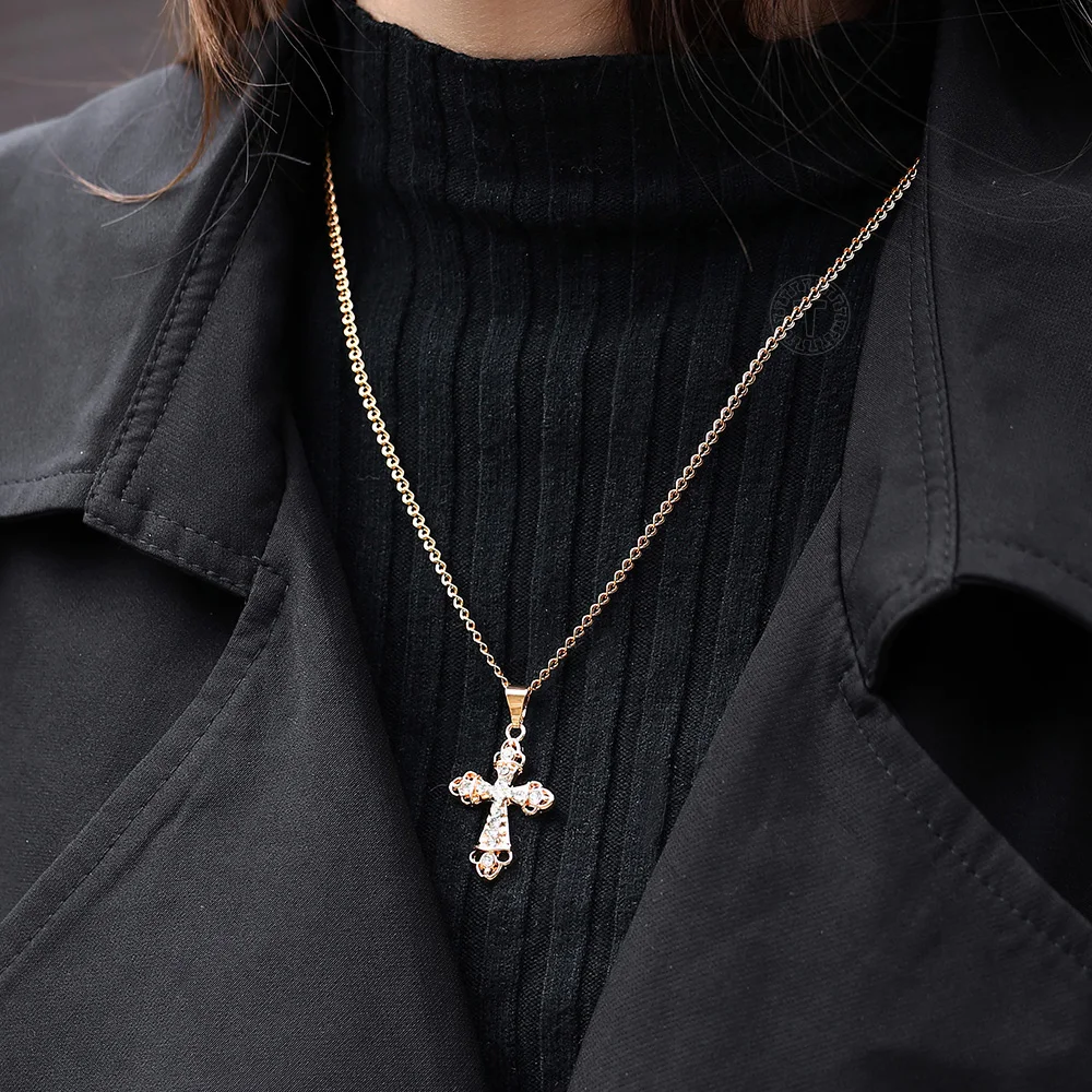 Ожерелье с кулоном, розовое золото 585 пробы, крест, распятие, прозрачный кристалл для мужчин, женщин, молитва, Иисус, цепочка, 50 см, модные украшения GPM26