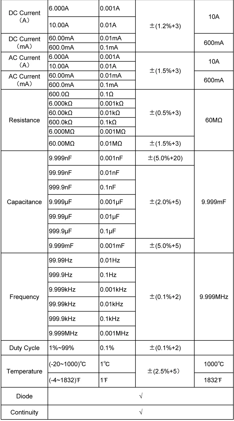 Мультиметр не имеет диапазонов тока 600.0uA и 6000uA для DC и AC, которые были представлены в описании товара. К сожалению, я получил частичный возврат за это, спасибо Aliexpress.