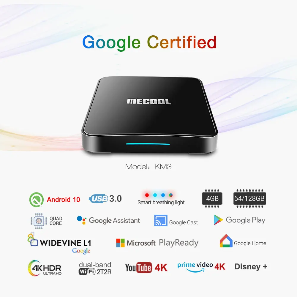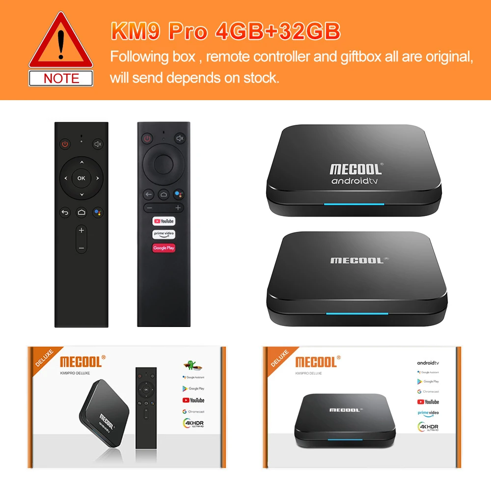 Mecool KM9 PRO:-Четырехъядерный процессор ARM Cortex Amlogic S905X2-процессор A53-Google Android 10,0/9,0 pie ATV OS-RAM/ROM: 2 ГБ/16 ГБ, 4 ГБ/32 ГБ-Светодиодный индикатор: умный дыхательный свет-Поддержка 4K, HDR, H.265, 3D-Поддержка 10/100M Ethernet, 2,4G и 5GHz двухдиапазонный Wi-Fi, BT 4,0 + HS-Поддержка официального Youtube 4K-Поддержка официального магазина Google Play, фильмов и ТВ Google Play, музыки Google Play-Поддержка Google Cast, поделитесь видео с телевизором-Поддержка голосового ввода через дистанционное управление BT-Для коробки KM9 PRO есть два варианта:Классическая версия: 2 Гб + 16 ГБ + 2,4G WifiDeluxe Edition: 4 Гб + 32 ГБ + 2,4 ГГц и 5,8 ггц Wifi + BT4.0Mecool KM3 ATV:-Четырехъядерный процессор ARM Cortex Amlogic S905X2-процессор A53-Google Android 10,0/9,0 pie ATV OS-RAM/ROM: 4 ГБ/64 ГБ, 4 ГБ/128 ГБ-Светодиодный индикатор: умный дыхательный свет-Поддержка 4K, HDR, H.265, 3D-Поддержка 10/100M Ethernet, 2,4G и 5GHz двухдиапазонный Wi-Fi, BT 4,0 + HS-Поддержка официального Youtube 4K-Поддержка официального магазина Google Play, фильмов и ТВ Google Play, музыки Google Play-Поддержка Google Cast, поделитесь видео с телевизором-Поддержка голосового ввода через дистанционное управление BT-Для коробки квадроцикла KM3 есть два варианта:Коллективная версия: 4 Гб + 64 ГБ + 2,4 ГГц и 5,8 ГГц Wi-Fi + BT4.0 + 2T2RРедкая версия: 4 Гб + 128 ГБ + 2,4 ГГц и 5,8 ГГц Wi-Fi + BT4.0 + 2T2R