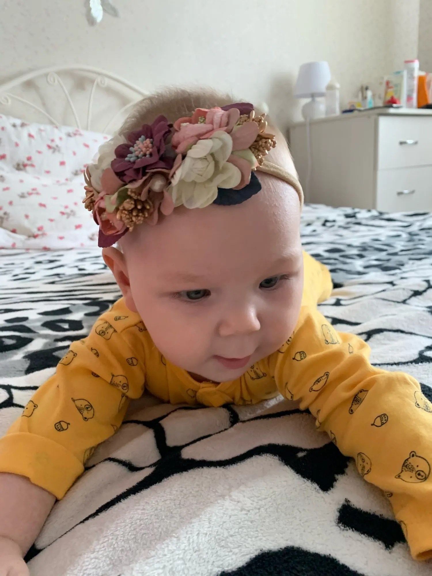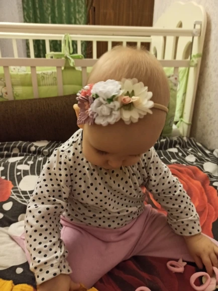 Очень красивая повязка. Отлично держится на голове и не стягивает. Думаю, до года точно будет супер!